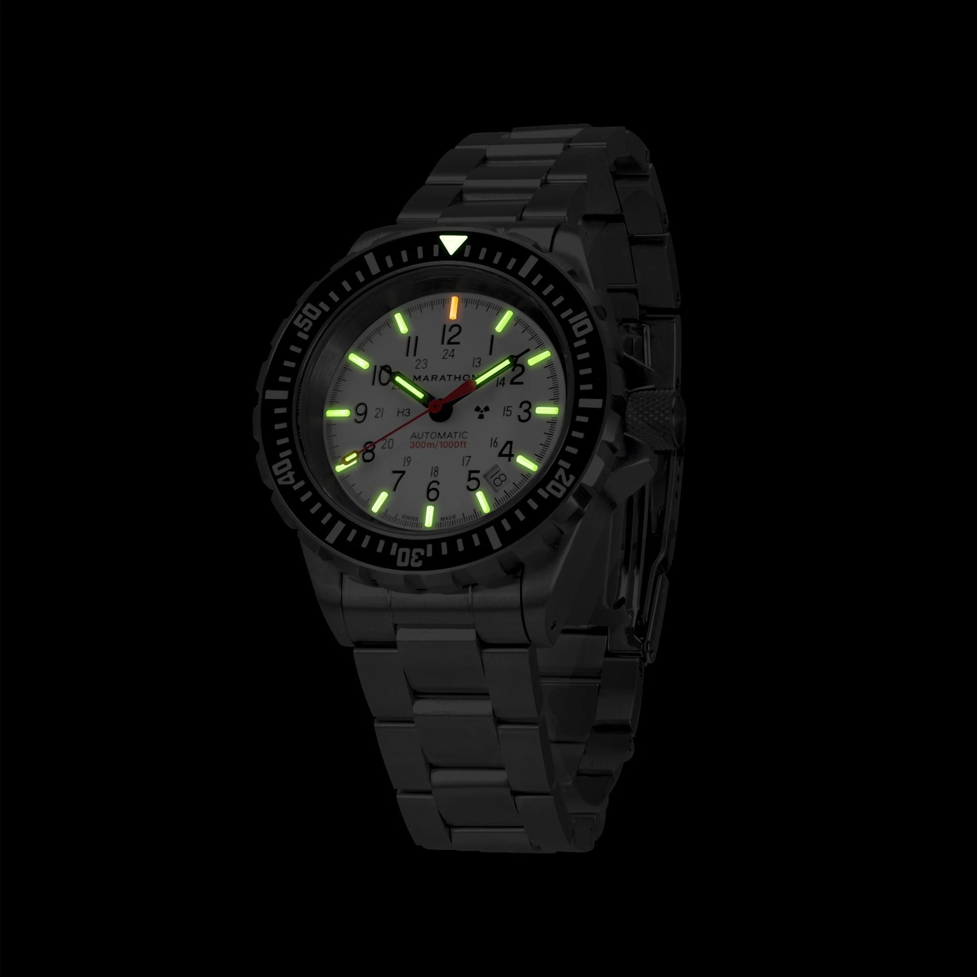 The Swiss Made Large Diver's Automatic (GSAR) is a dive watch certified for water resistance down to 30ATM(1000 feet). The GSAR is built from 316L surgical grade stainless steel with a scratch resistant sapphire glass crystal. The watch uses self contained tritium gas tubes to ensure constant visibility in low light situations. Manufactured in accordance with US Government MILSPEC. Automatic Swiss Made 26 jewels movement.