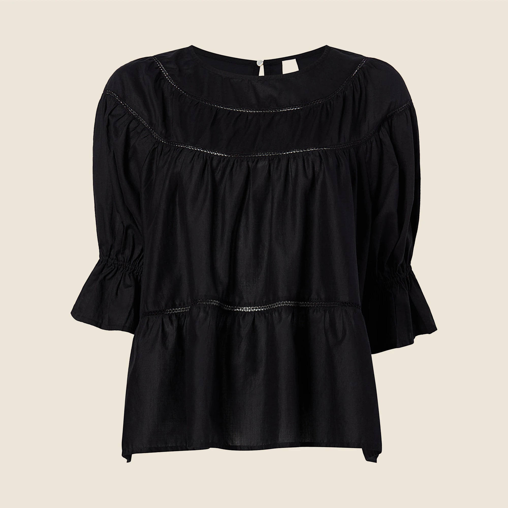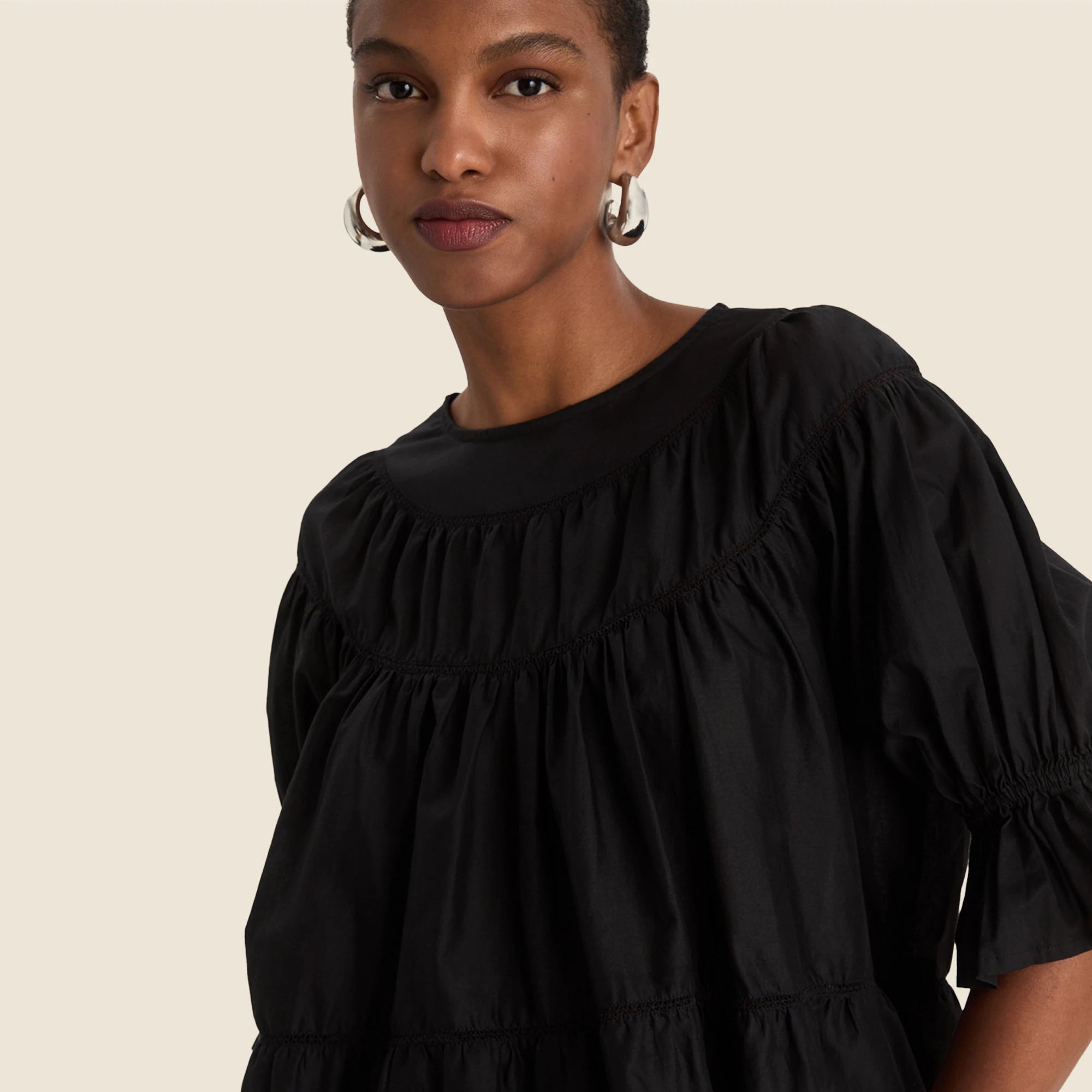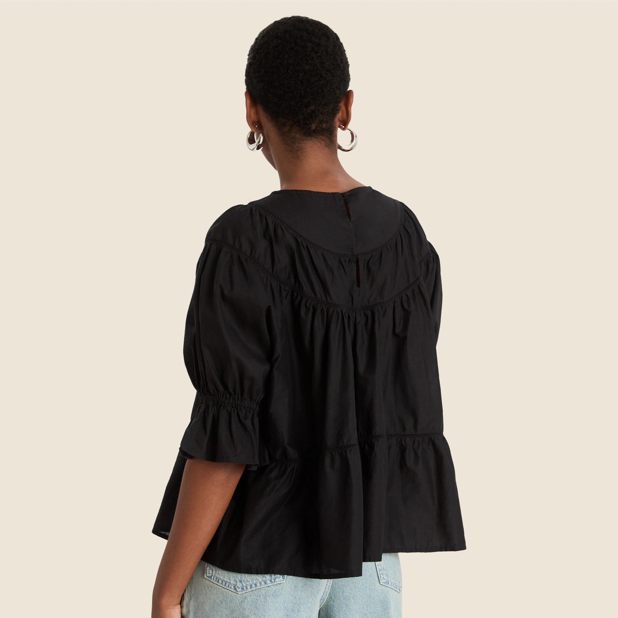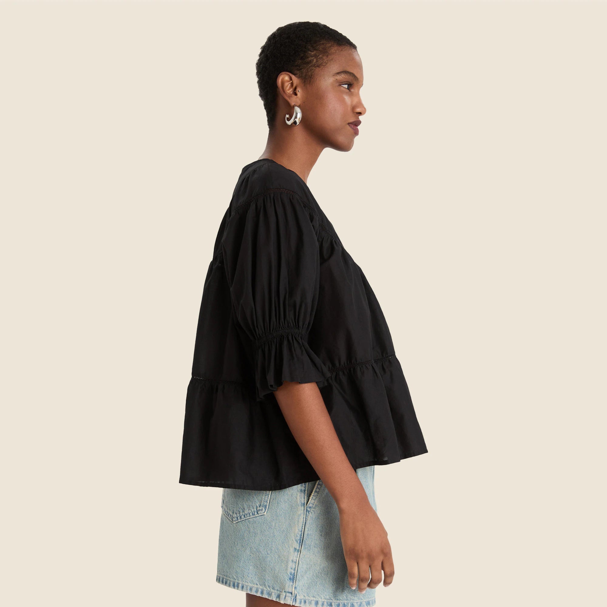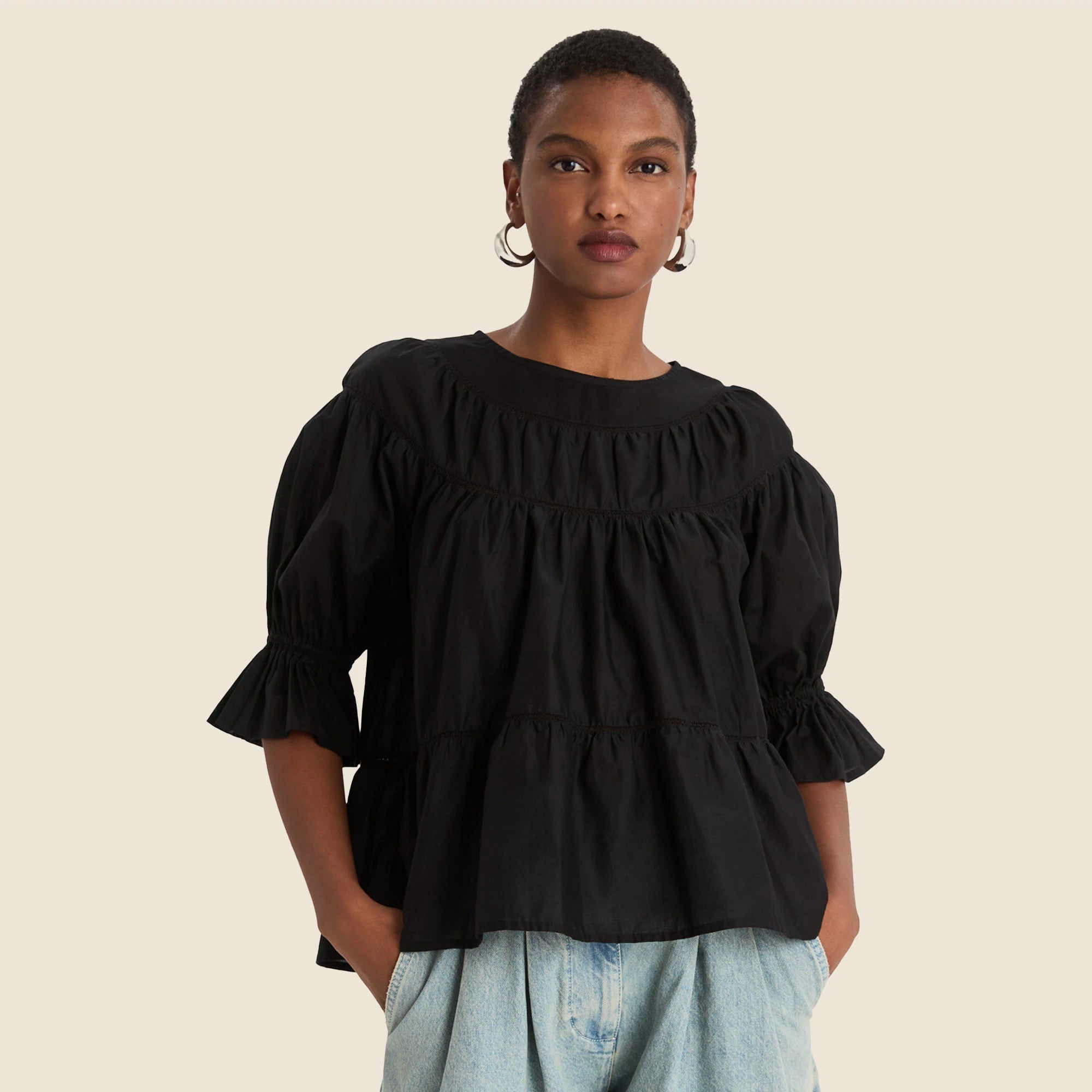 Merlette is a New York-based atelier, creating thoughtfully designed garments with the modern woman and her everyday life in mind. Merlette was founded in 2016 by designer Marina Cortbawi, with a dedication to refining shape, texture and details into a sense of empowered femininity, allowing women to feel elegant and at ease. The Sol Top is an elevated everyday piece with tiered elegance, refined puff sleeves and softly structured femininity.
