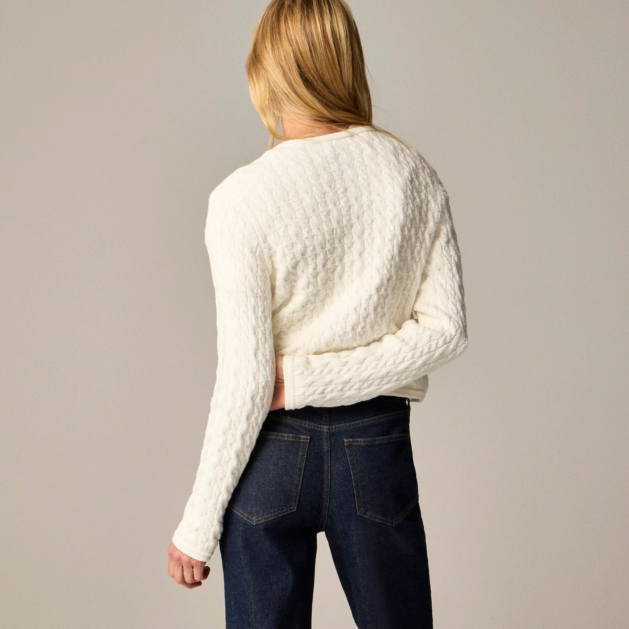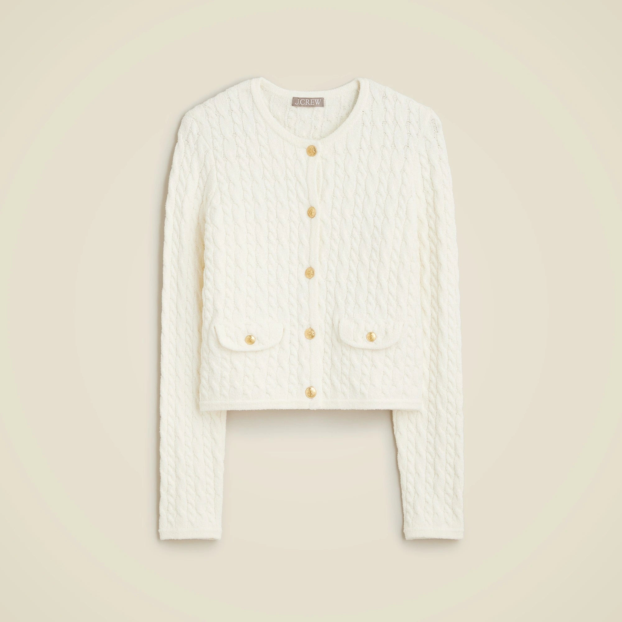 A cable-knit take on our customer-favorite layer. Somewhere between a jacket and a cardigan, crafted from cozy cotton bouclé in a cable-knit stitch. Plus, this version comes with all the classic details, like gold crest buttons down the front and flap pockets.