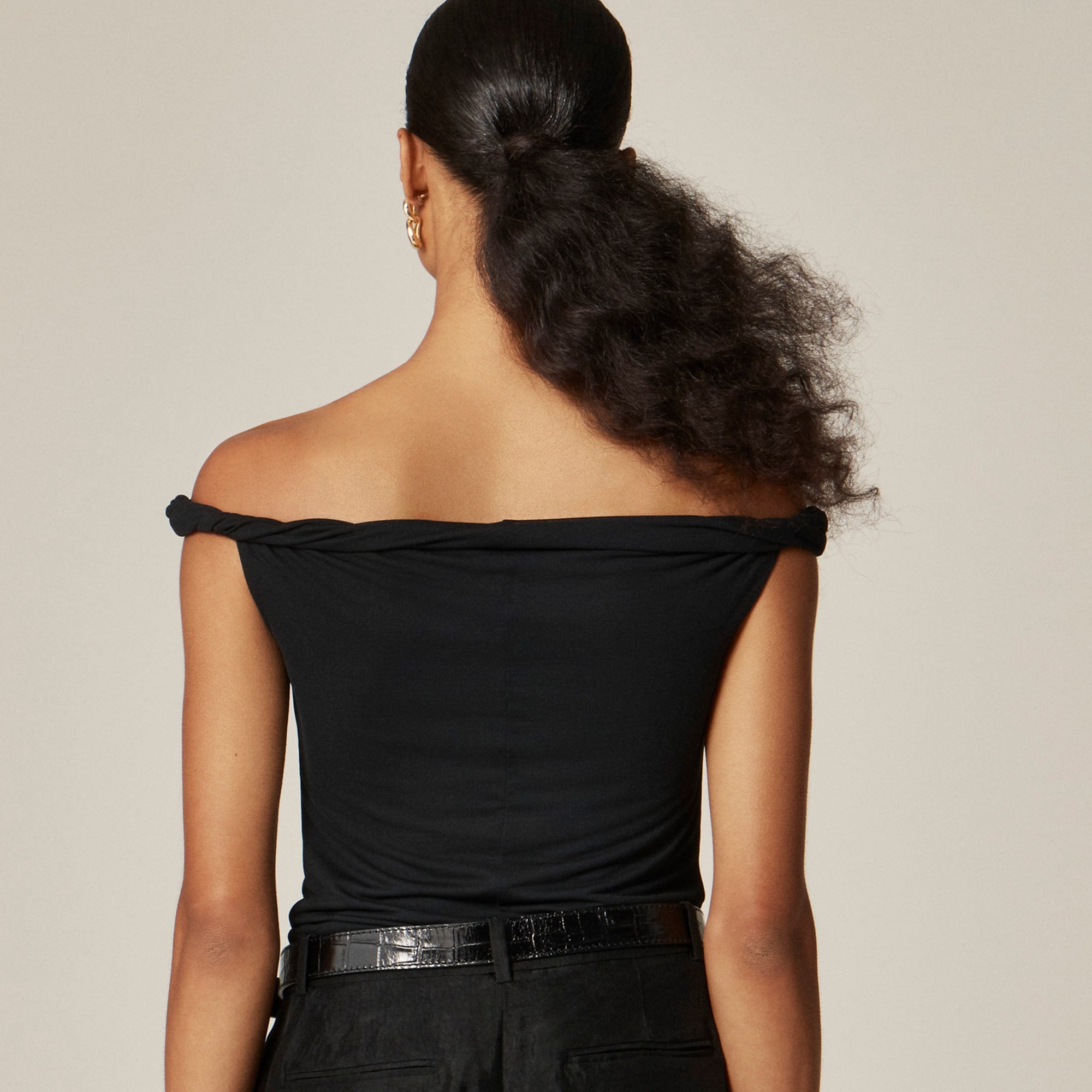 Made to dress up your date night. This off-the-shoulder twist tank is designed in a close-to-the-body fit that's flattering, feminine and ready for your dinner plans. Plus, it's crafted from our smooth matte jersey that skims the body and comes with a touch of stretch for all-day (and all-night) comfort. Bonus: It's sheer but double-layered for a little extra coverage.
