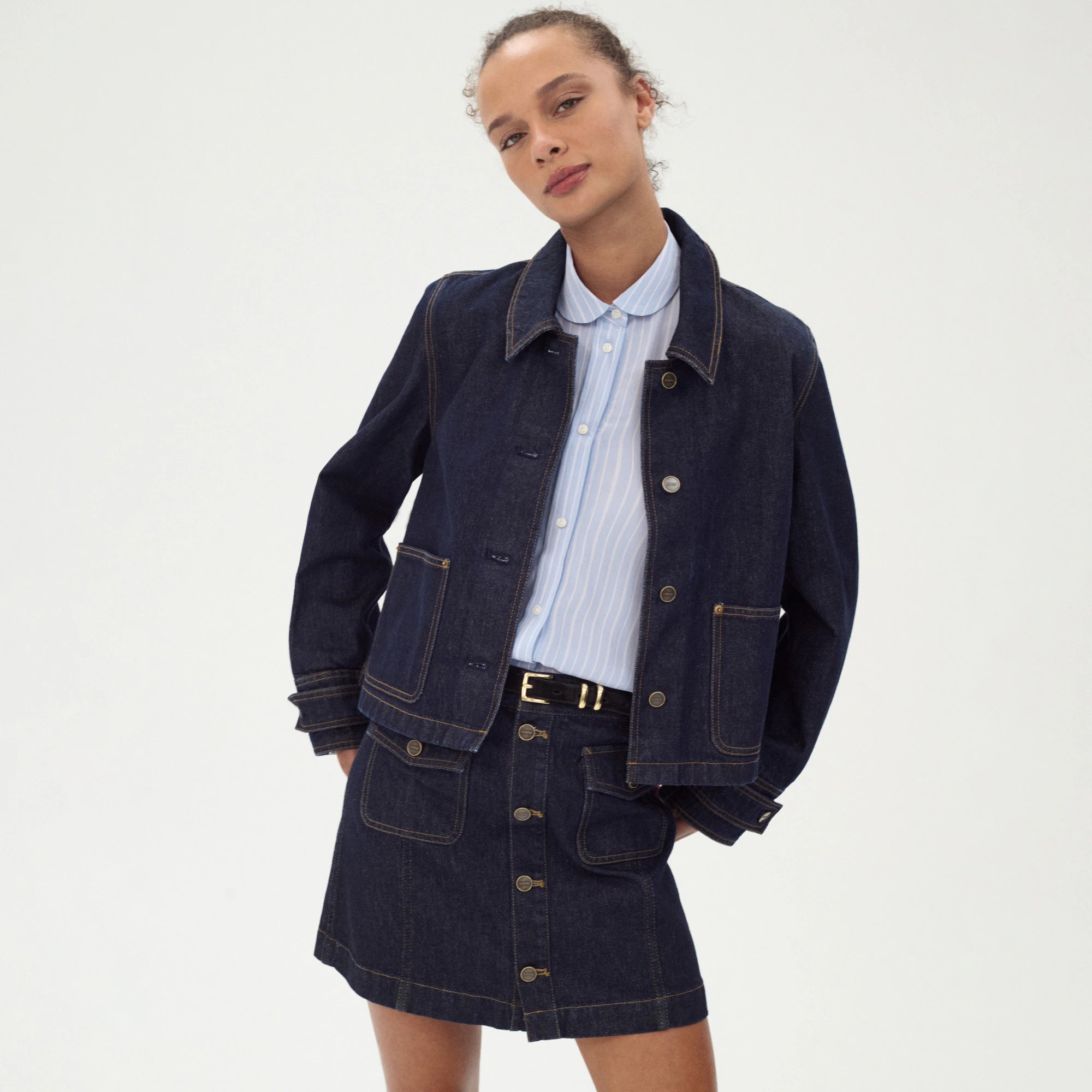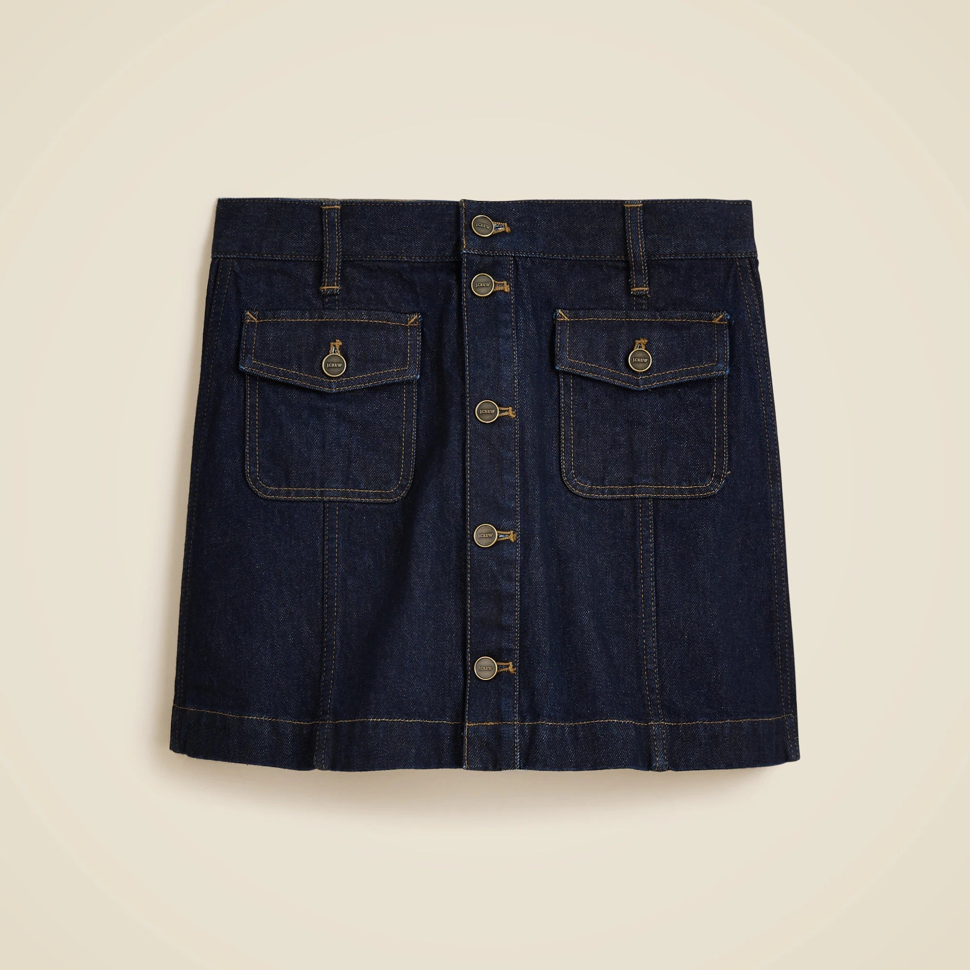 Because every closet needs a classic denim skirt. . .This streamlined mini silhouette comes with heritage-inspired patch pockets and a clean, dark wash that's as timeless as ever.