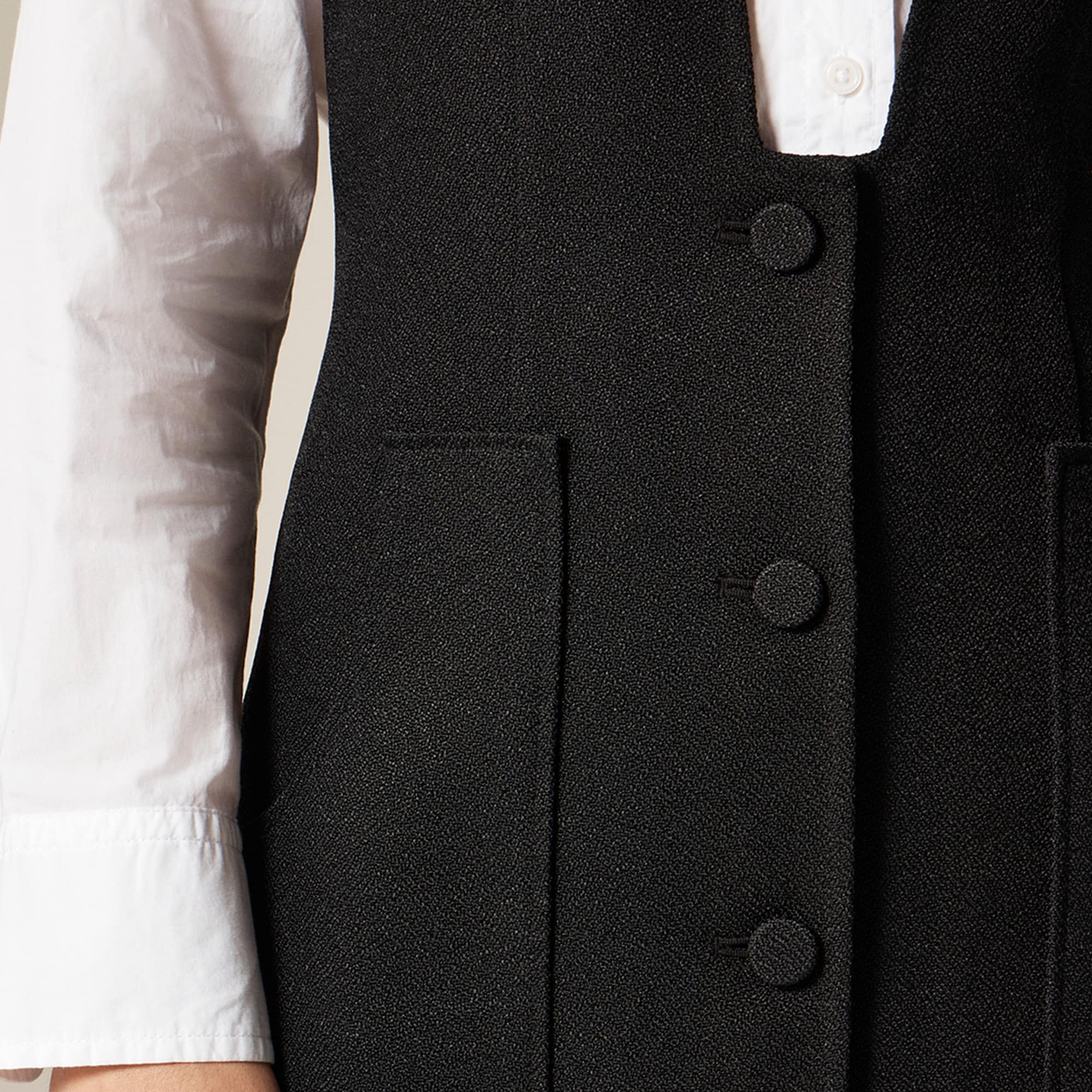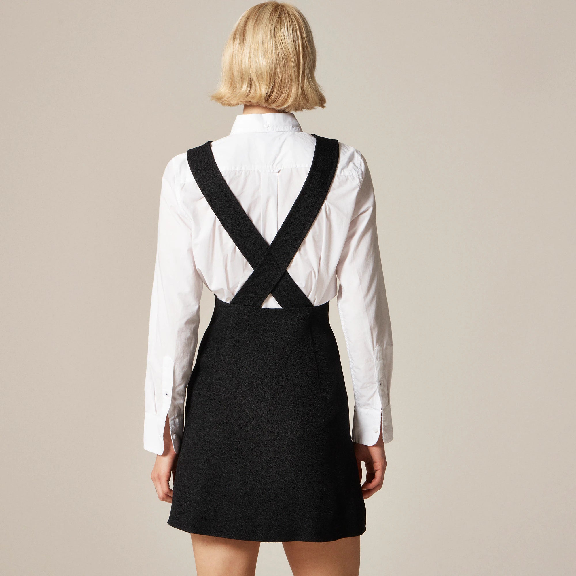 A modern take on the classic pinafore silhouette. This mini dress is designed with a deep V neckline, covered buttons down the front and wide straps that cross at the back. It comes with heritage-inspired patch pockets for practicality and an easy A-line shape, so it's perfect layered over crisp shirts, fine knits or even tees. Plus, it's crafted from 100 percent viscose fabric with a dimensional bouclé texture for a refined look and feel.