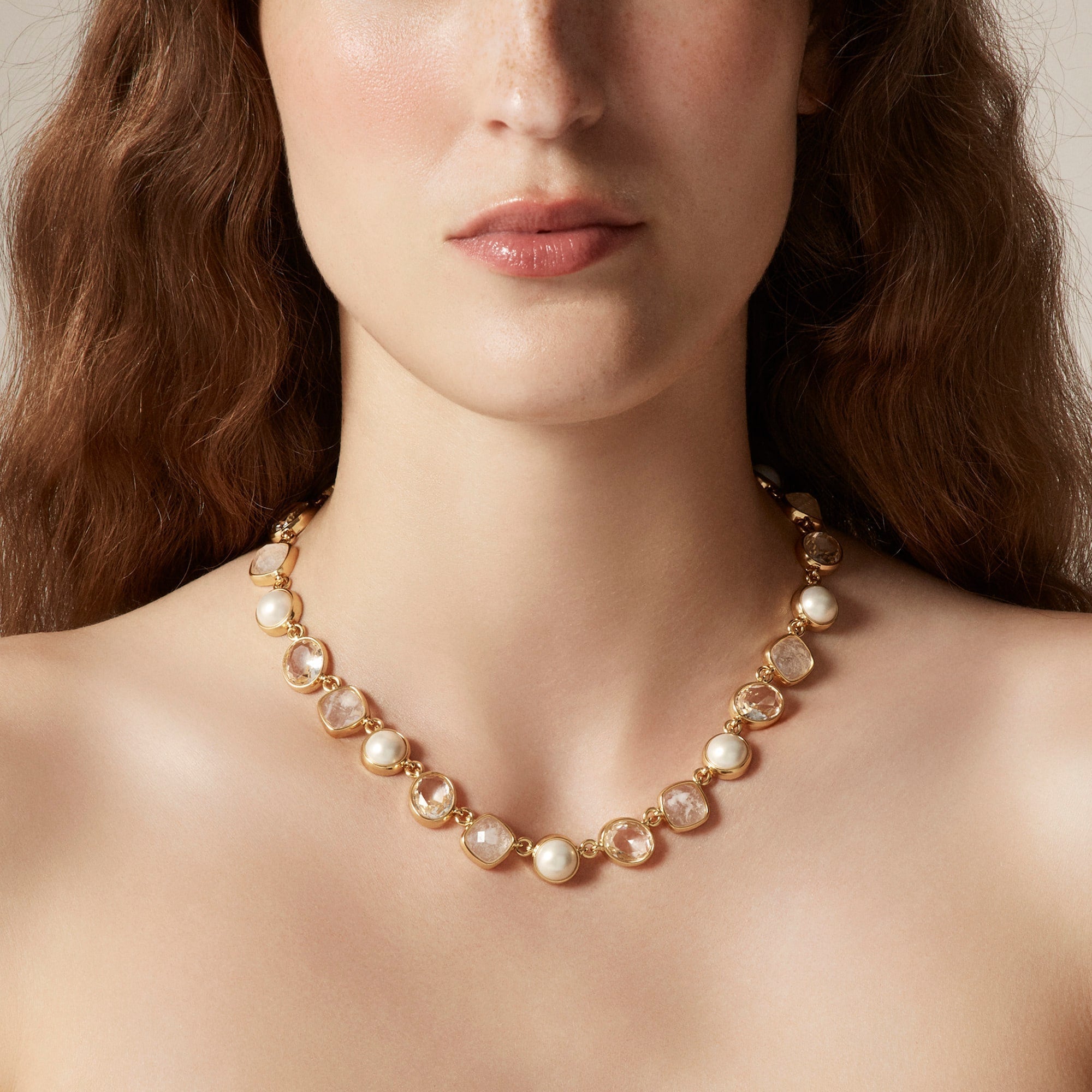 Add iridescent shine to special days (and every day!). This station necklace with inset pearls and stones always looks good. Want to keep your jewelry looking like new? We recommend removing it before showering or exercise and putting it on after applying hair products or perfume. To clean your pieces, polish them with a soft, dry cloth—and when not wearing, store them in a pouch or jewelry case.