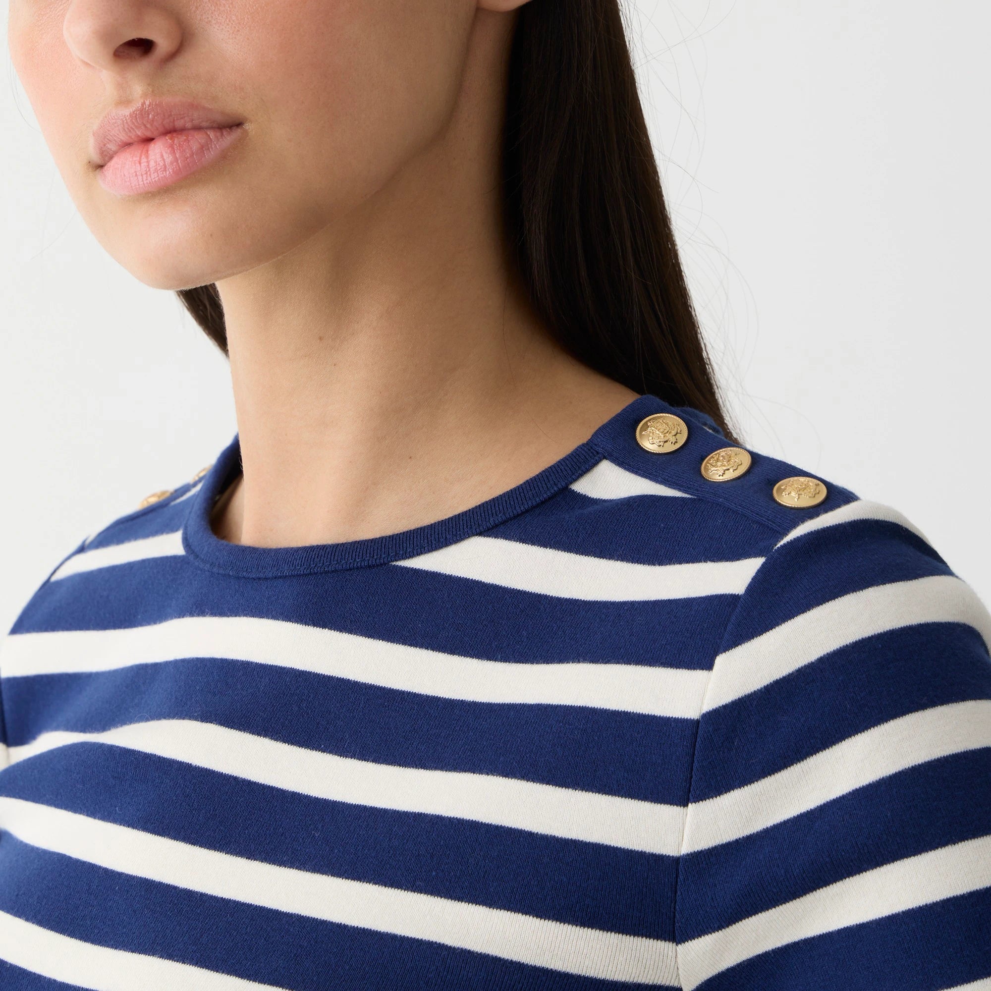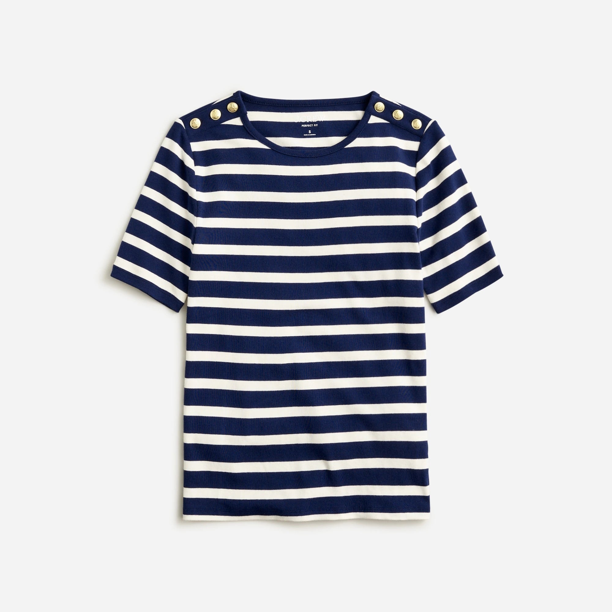The perfect-fit T-shirt you love, now with longer sleeves. This one also comes with polished gold button details down each shoulder and a classic stripe print. By buying cotton products from J.Crew, you're supporting our investment in Better Cotton's mission to help cotton communities survive and thrive while protecting and restoring the environment. This product is sourced via a system of mass balance and therefore may not contain Better Cotton.