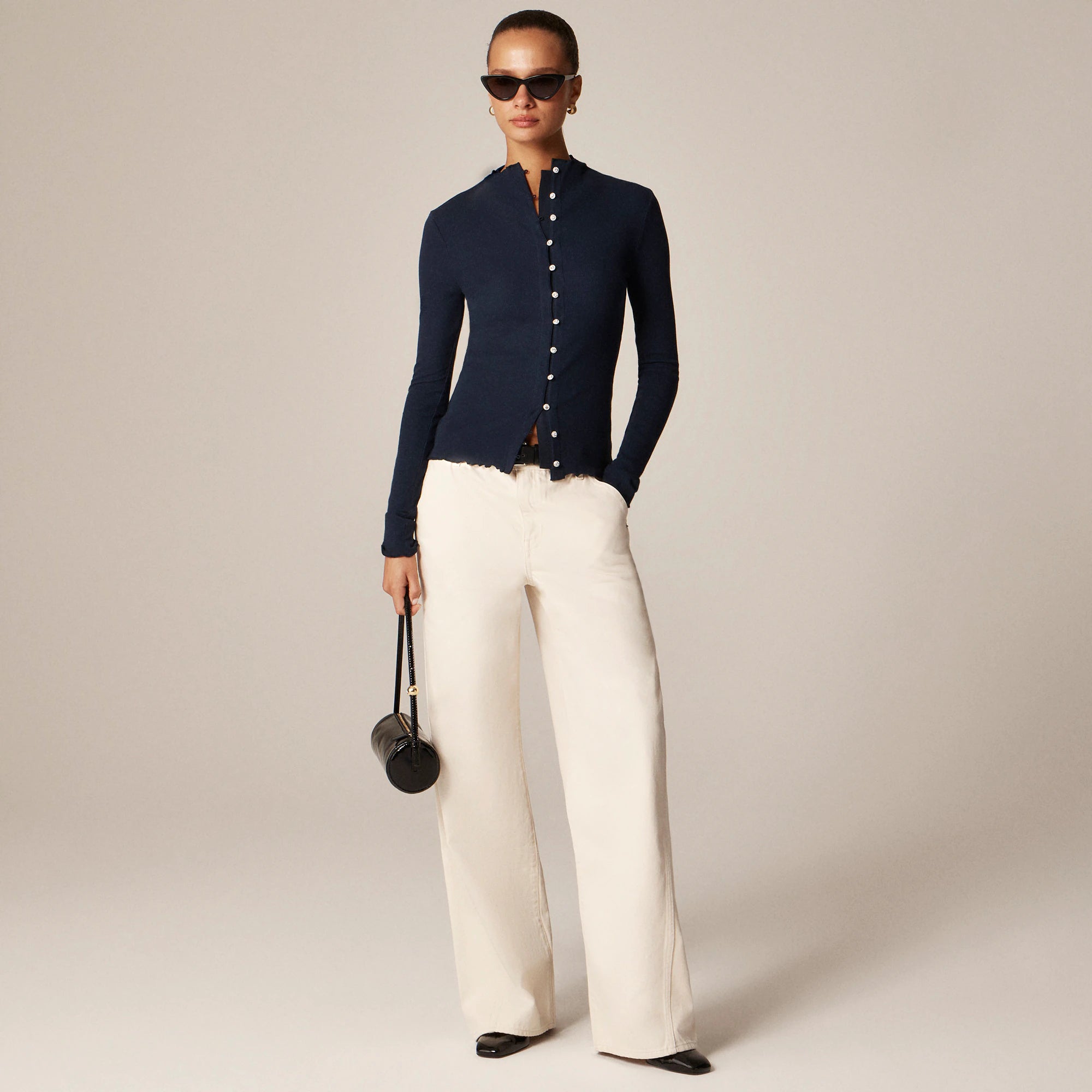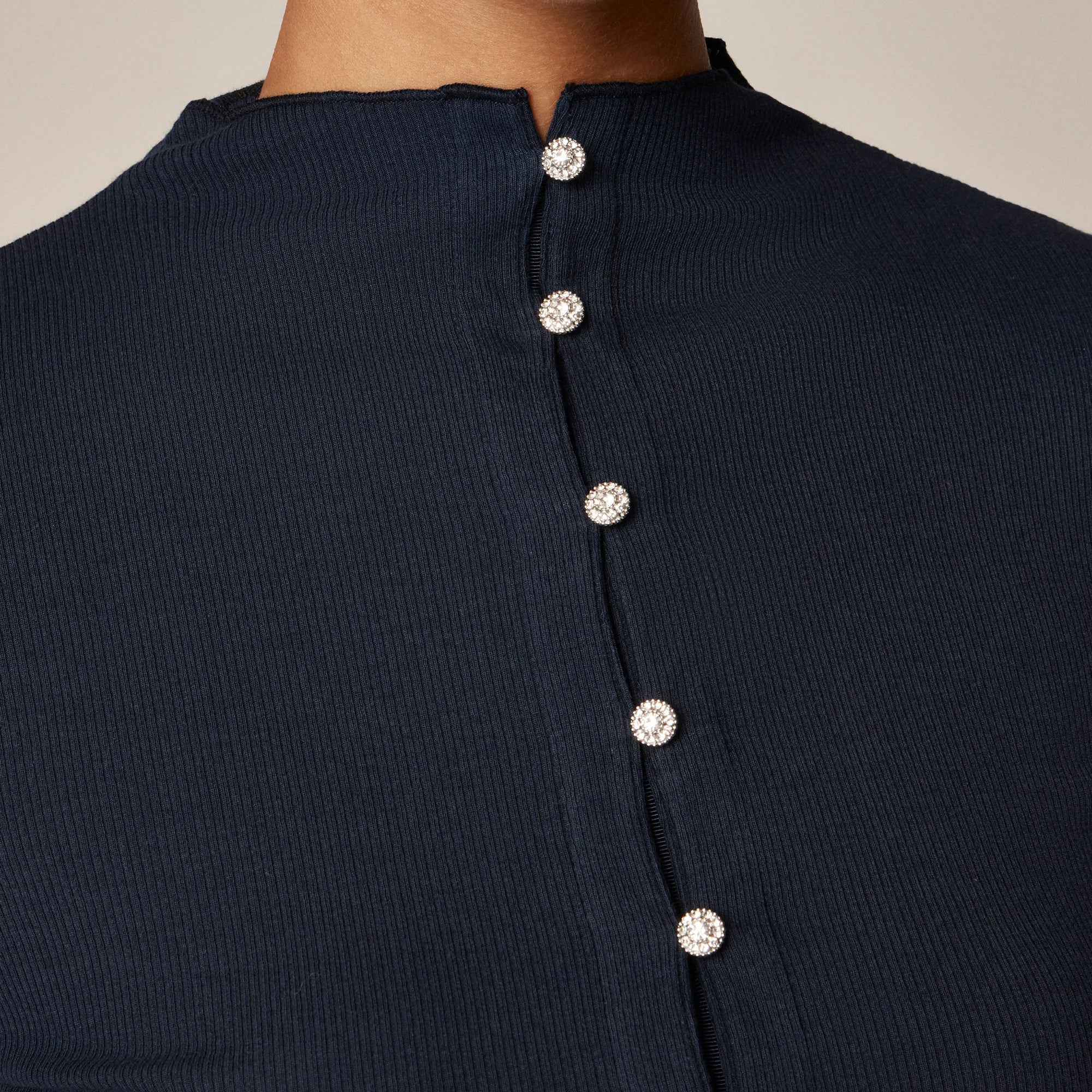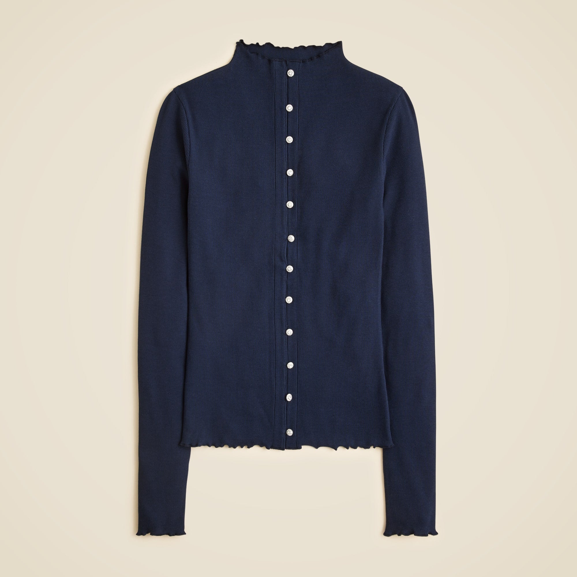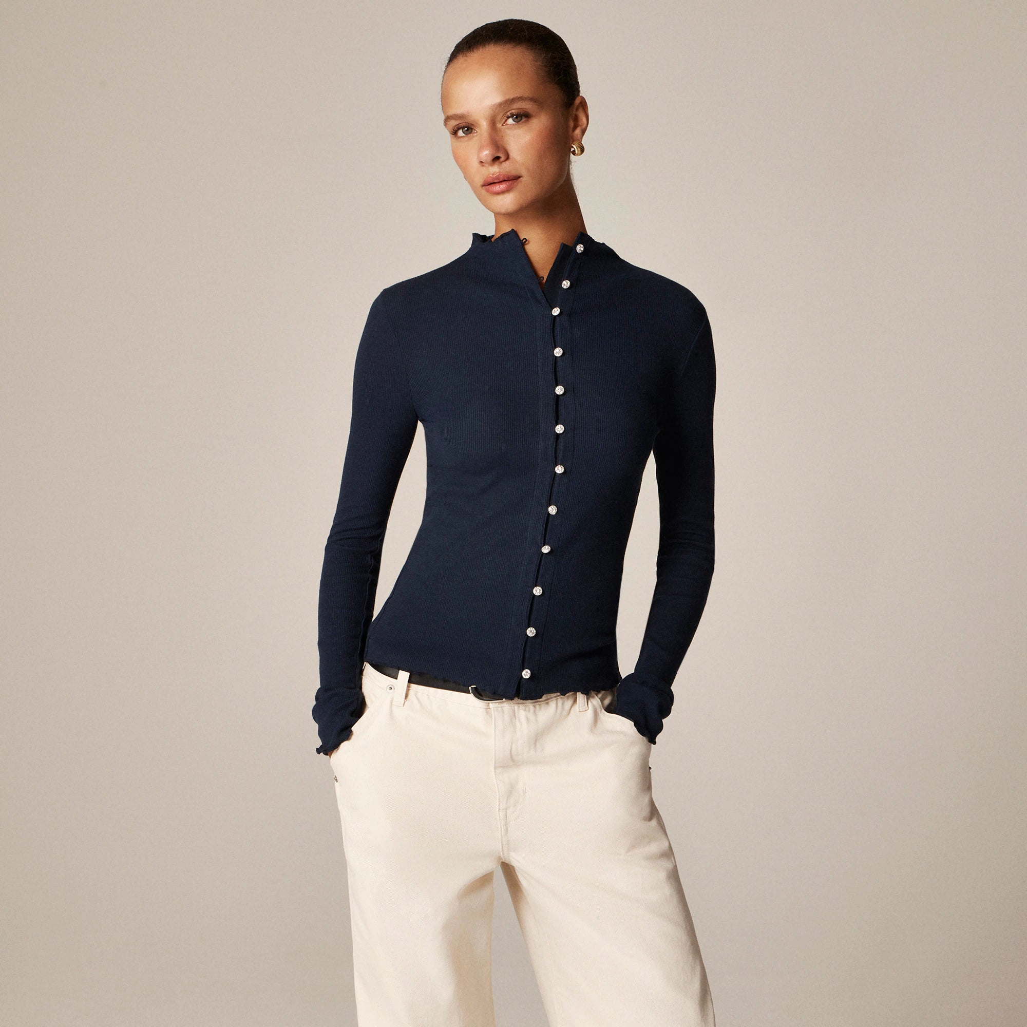 A sweet silhouette that's all about the details. This stylish layer has ruffle-trim detailing, sparkling jewel buttons and a subtle mockneck. It looks just as good on its own as it does over camisoles, turtlenecks and pretty much everything else we can think of. Plus, it's crafted from our new perfect rib fabric that has a softly textured finish and just the right amount of stretch.
