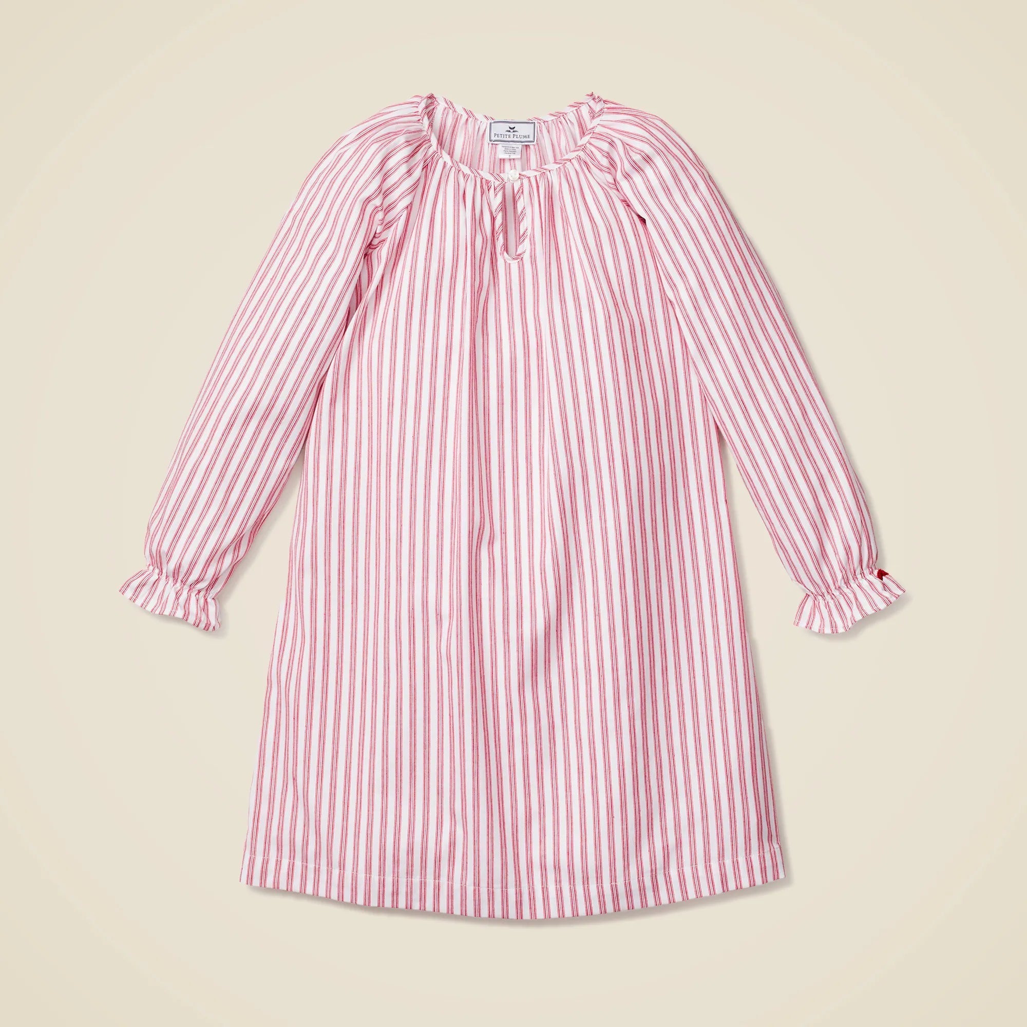 Petite Plume was inspired by the desire to create sophisticated and comfortable sleepwear in the most exquisite cotton available. With Petite Plume, your family will be tucked in love and off to dreamland. Bonne nuit. The Delphine Nightgown whispers of yesteryear with its sweet tie accent on the chest and angelic bell sleeves. This nightgown is a lightweight, very soft flannel. The sleepwear is made from the finest quality yarn-dyed cotton and blended with just enough inherently flame-retardant fiber to allow it to pass strict CPSC flame-retardant laws without using harmful chemicals. The fabric is brushed for added softness, making the sleepwear feel absolutely luxurious, getting cozier after each wash.