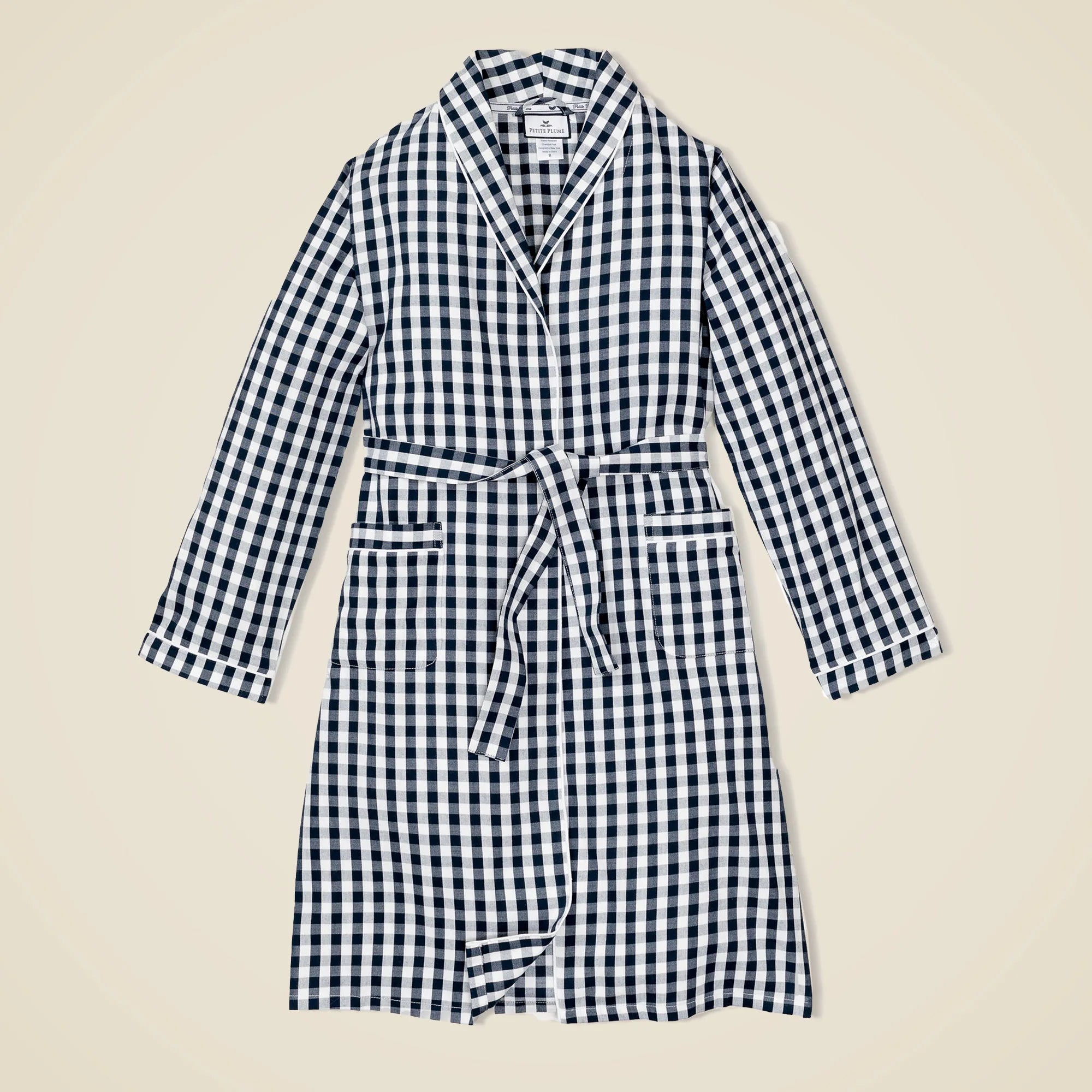 Petite Plume was inspired by the desire to create sophisticated and comfortable sleepwear in the most exquisite fabrics available. With Petite Plume, your family will be tucked in love and off to dreamland. Bonne nuit. This elegant robe is the perfect addition to our collection. The classic pattern is a staple and will have you looking smart in no time. The sleepwear is made from the finest-quality yarn-dyed cotton and blended with just enough inherently flame-retardant fiber to allow it to pass strict CPSC flame-retardant laws without using harmful chemicals. The fabric is brushed for added softness, making the sleepwear feel absolutely luxurious, getting cozier after each wash.