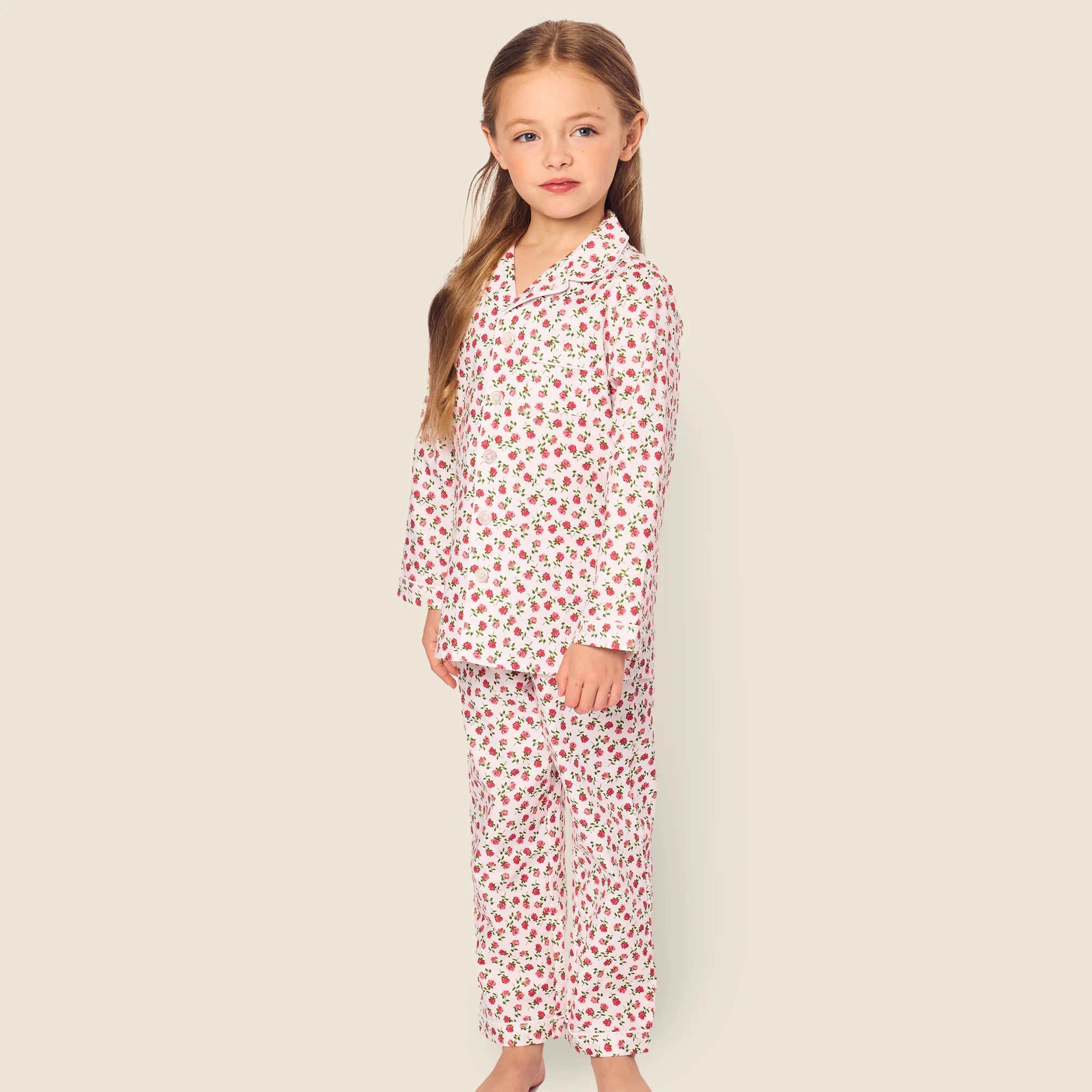 Petite Plume was inspired by the desire to create sophisticated and comfortable sleepwear in the most exquisite fabrics available. With Petite Plume, your family will be tucked in love and off to dreamland. Bonne nuit. Dream of beautiful bouquets with this sweet new take on florals. This classic pajama set is accented with piping and finished with buttons. It is made from the finest-quality yarn-dyed cotton and blended with just enough inherently flame-retardant fiber to allow it to pass strict CPSC flame-retardant laws without using harmful chemicals. The fabric is brushed for added softness, making the sleepwear feel absolutely luxurious, getting cozier after each wash.