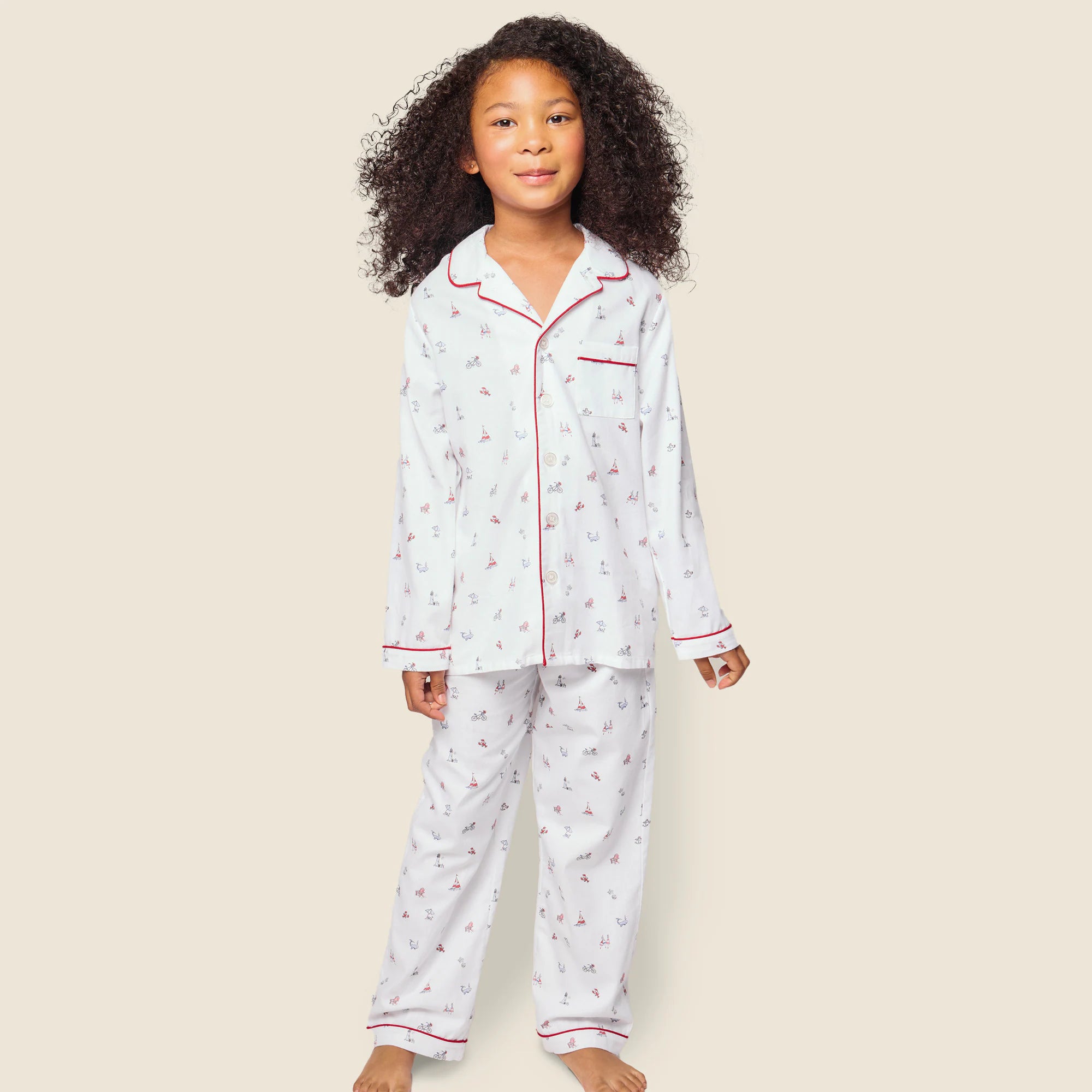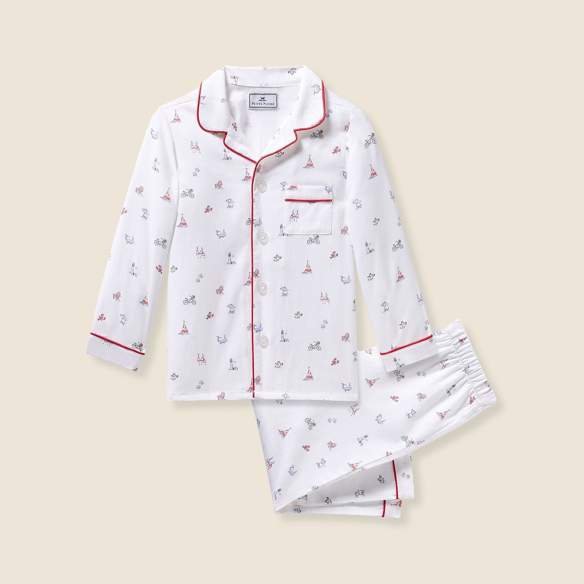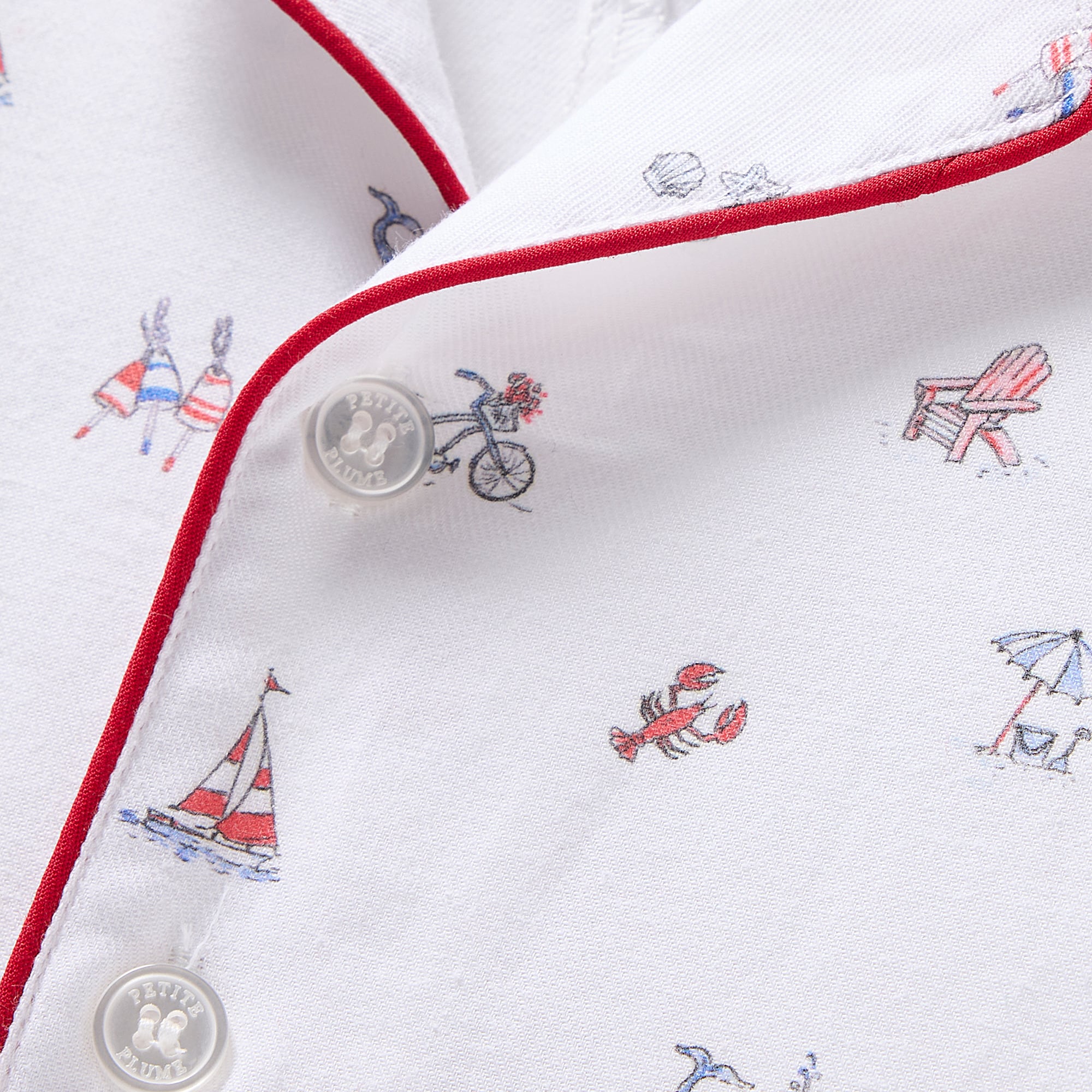 Petite Plume was inspired by the desire to create sophisticated and comfortable sleepwear in the most exquisite fabrics available. With Petite Plume, your family will be tucked in love and off to dreamland. Bonne nuit. Bicycles, sailboats, lobsters and whales are signs of summer fun to come. This print feels like carefree days and starlit nights. This classic pajama set is accented with contrast piping and finished with pearl buttons. The sleepwear is made from the finest-quality yarn-dyed cotton and blended with just enough inherently flame-retardant fiber to allow it to pass strict CPSC flame-retardant laws without using harmful chemicals.