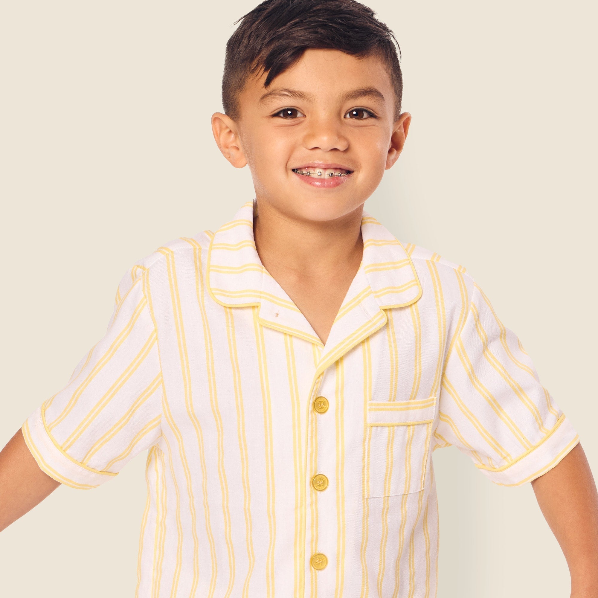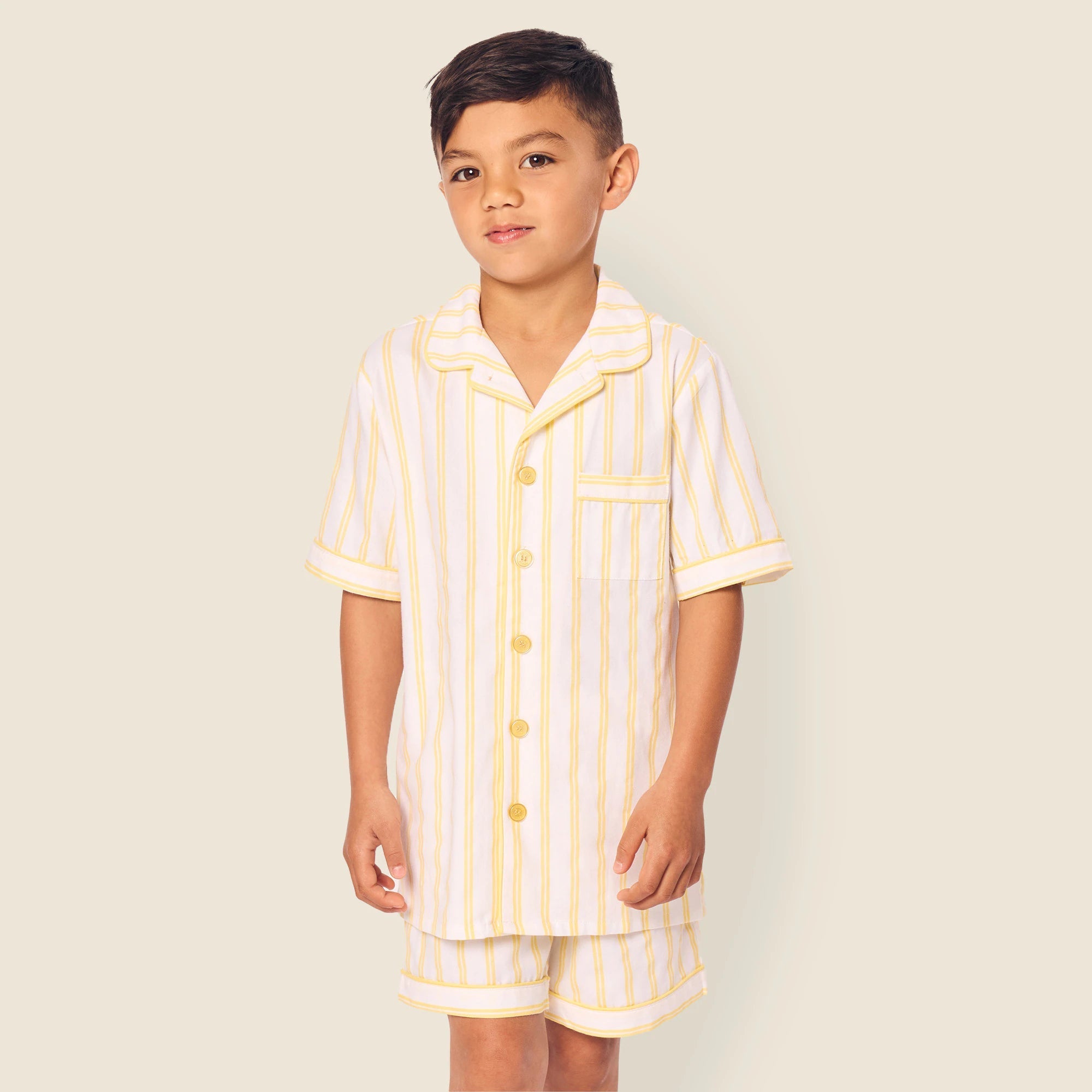 Petite Plume was inspired by the desire to create sophisticated and comfortable sleepwear in the most exquisite fabrics available. With Petite Plume, your family will be tucked in love and off to dreamland. Bonne nuit. Buttery stripes on this sunny print will get little ones excited for warmer play days. This classic set is accented with contrast piping and finished with pearl buttons. It is made from the finest-quality yarn-dyed cotton and blended with just enough inherently flame-retardant fiber to allow it to pass strict CPSC flame-retardant laws without using harmful chemicals. It is brushed for added softness, making the sleepwear feel absolutely luxurious, getting cozier after each wash.