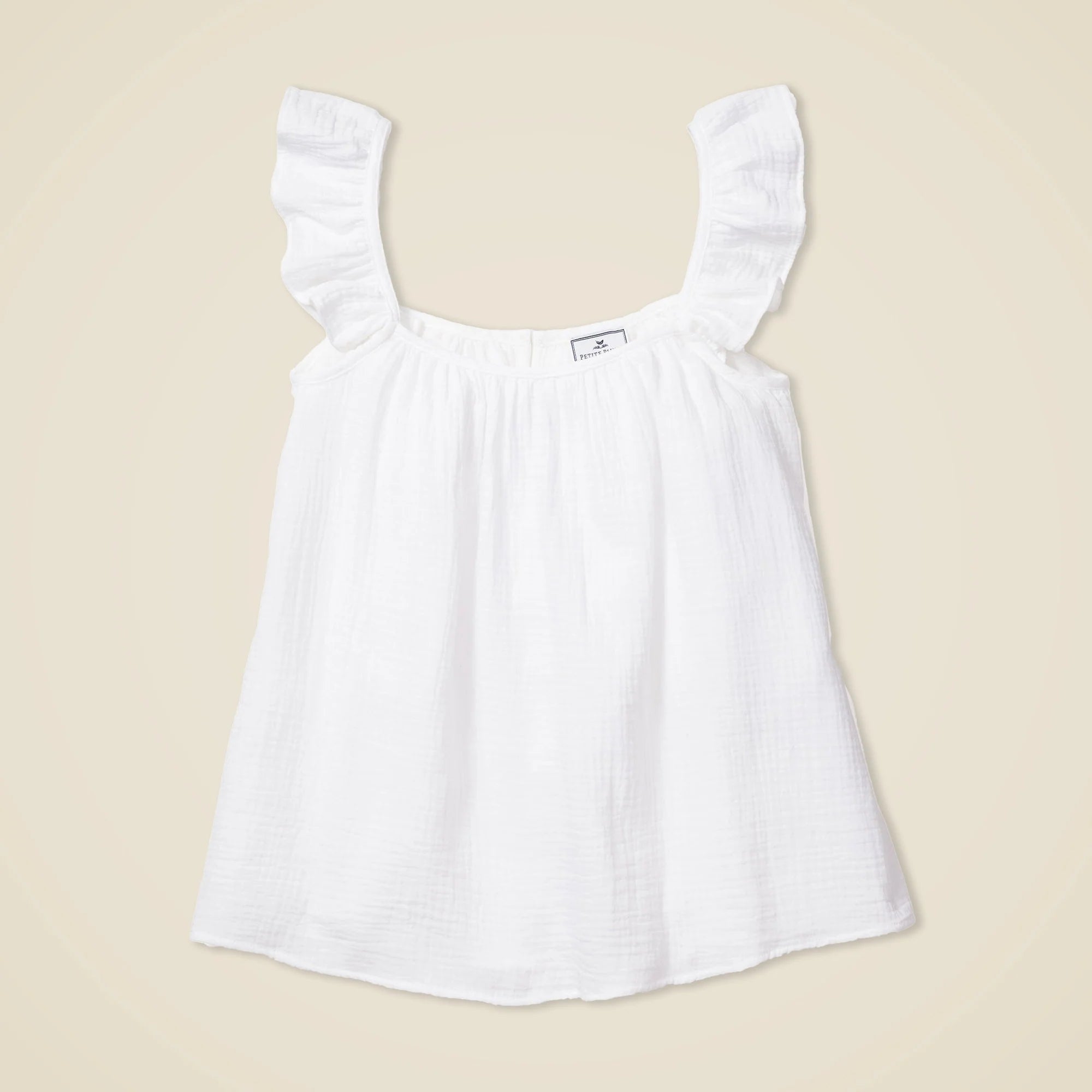 Petite Plume was inspired by the desire to create sophisticated and comfortable sleepwear in the most exquisite fabrics available. With Petite Plume, your family will be tucked in love and off to dreamland. Bonne nuit. All the femininity of ruffles, but simplified and refined, the Celeste top boasts a lovely flutter of gauze at the shoulder and a comfortable A-line bodice that extends over the hip. Our luxury Gauze Collection is designed with the warmer months in mind, with our unspeakably lightweight cotton gauze fabric in an array of feminine, yet tailored silhouettes, suggesting a return to mornings on the patio.