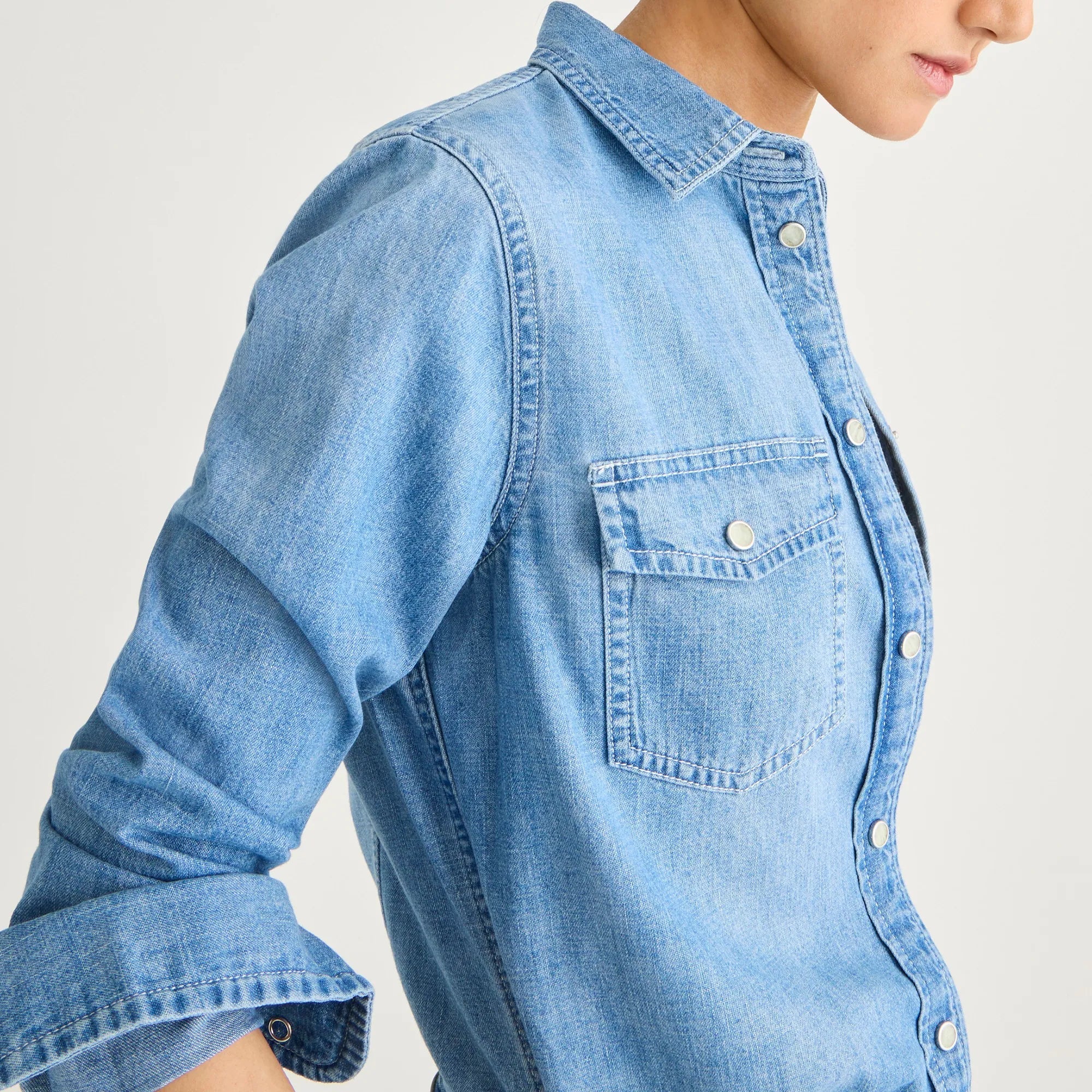 Our most fitted silhouette, now with western-inspired details. One of the latest additions to our shirt collection, this style is just the right length to tuck in without any bunching. This shirt also has pops of contrast stitching, two chest pockets and small snap buttons. Plus, it's made with our durable and finely textured chambray fabric that goes with everything. By buying cotton products from J.Crew, you're supporting our investment in Better Cotton's mission to help cotton communities survive and thrive, while protecting and restoring the environment. This product is sourced via a system of mass balance and therefore may not contain Better Cotton.