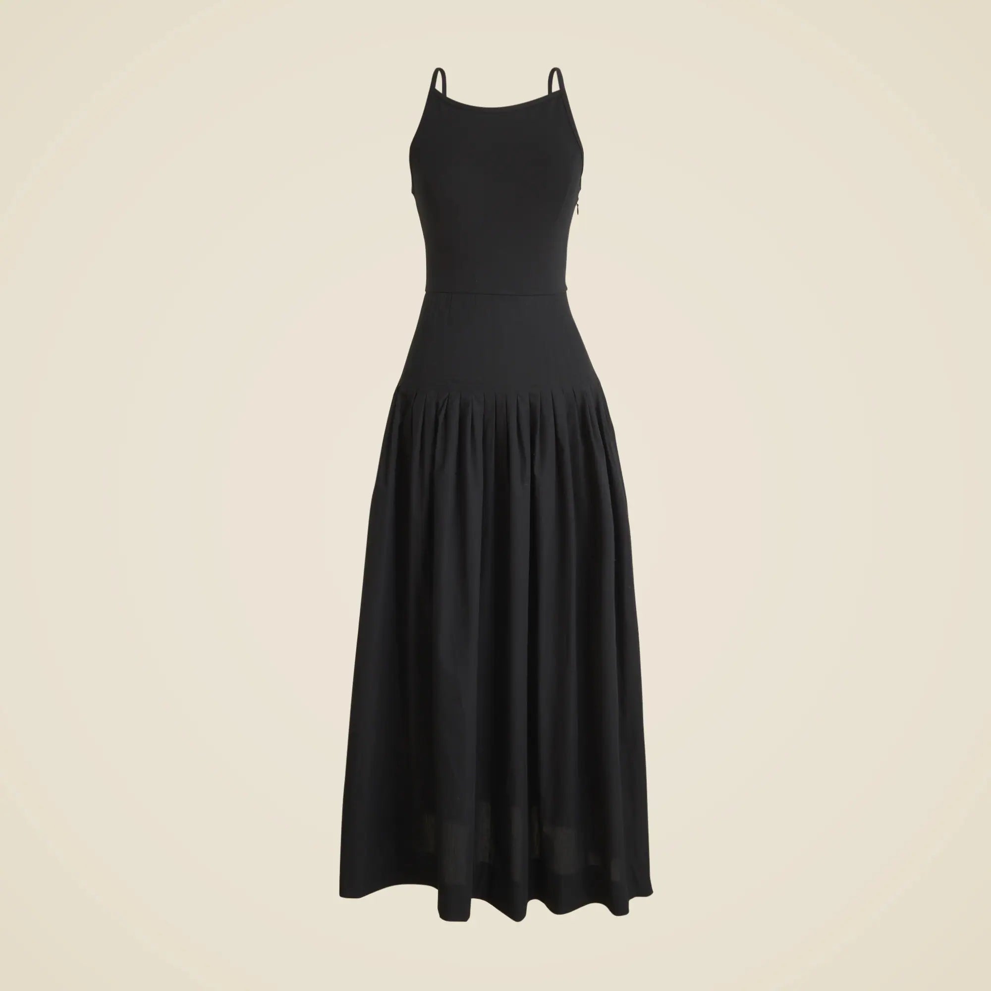 Two textures, one effortless outfit. Crafted from stretchy cotton on top and crisp poplin on the bottom, it comes with pintuck details along the waist that release into a full, flowy skirt.