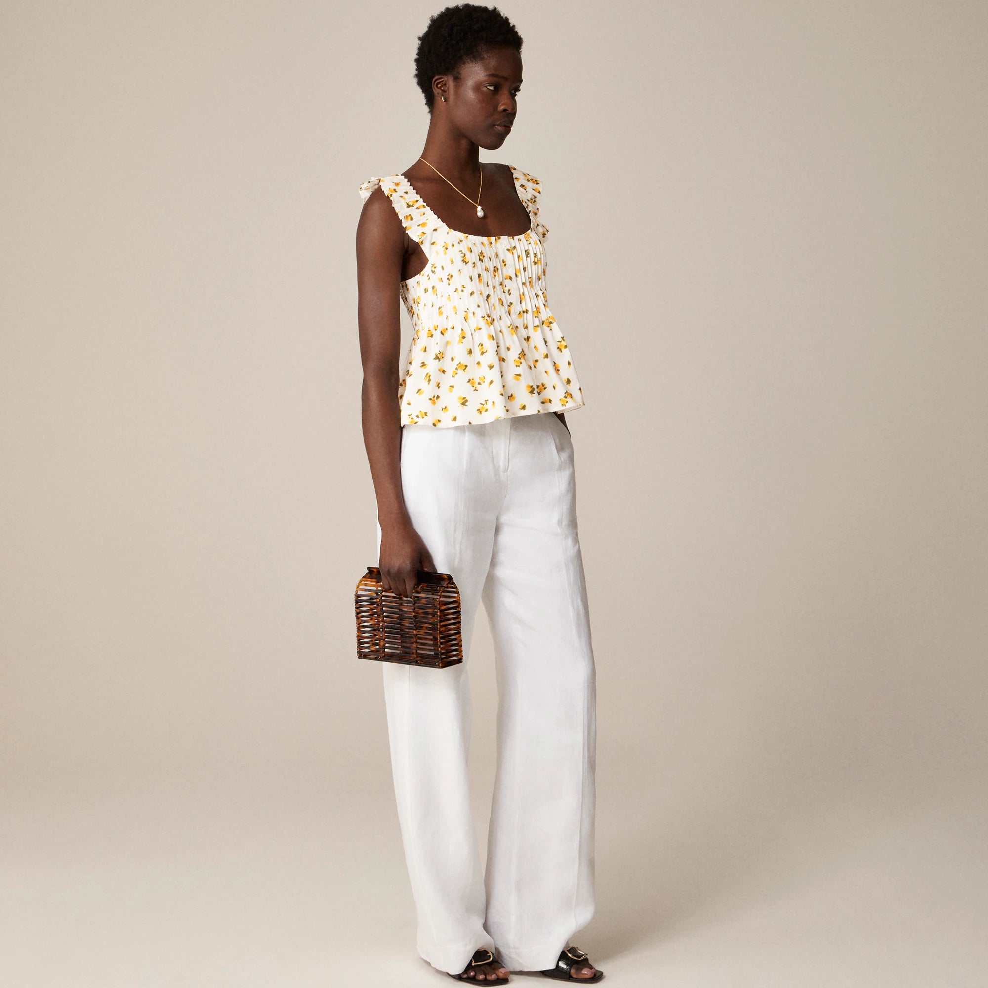 Soft structure meets thoughtful details. This floaty top comes with pretty pintucks along the bodice, ruffle cap sleeves and a peplum fit that flares out around the bottom. Plus, it's crafted from crisp cotton poplin for that just-pressed look and feel.