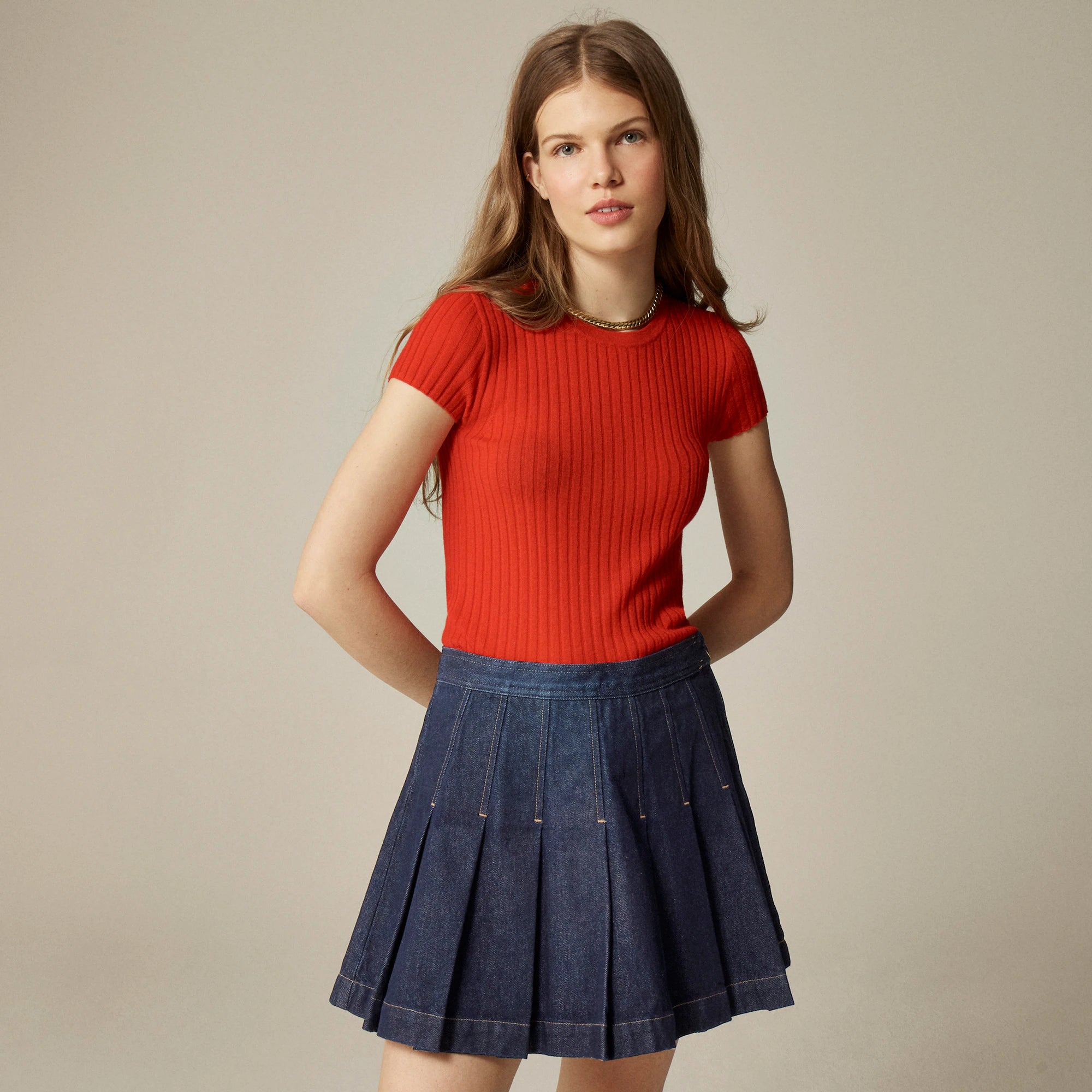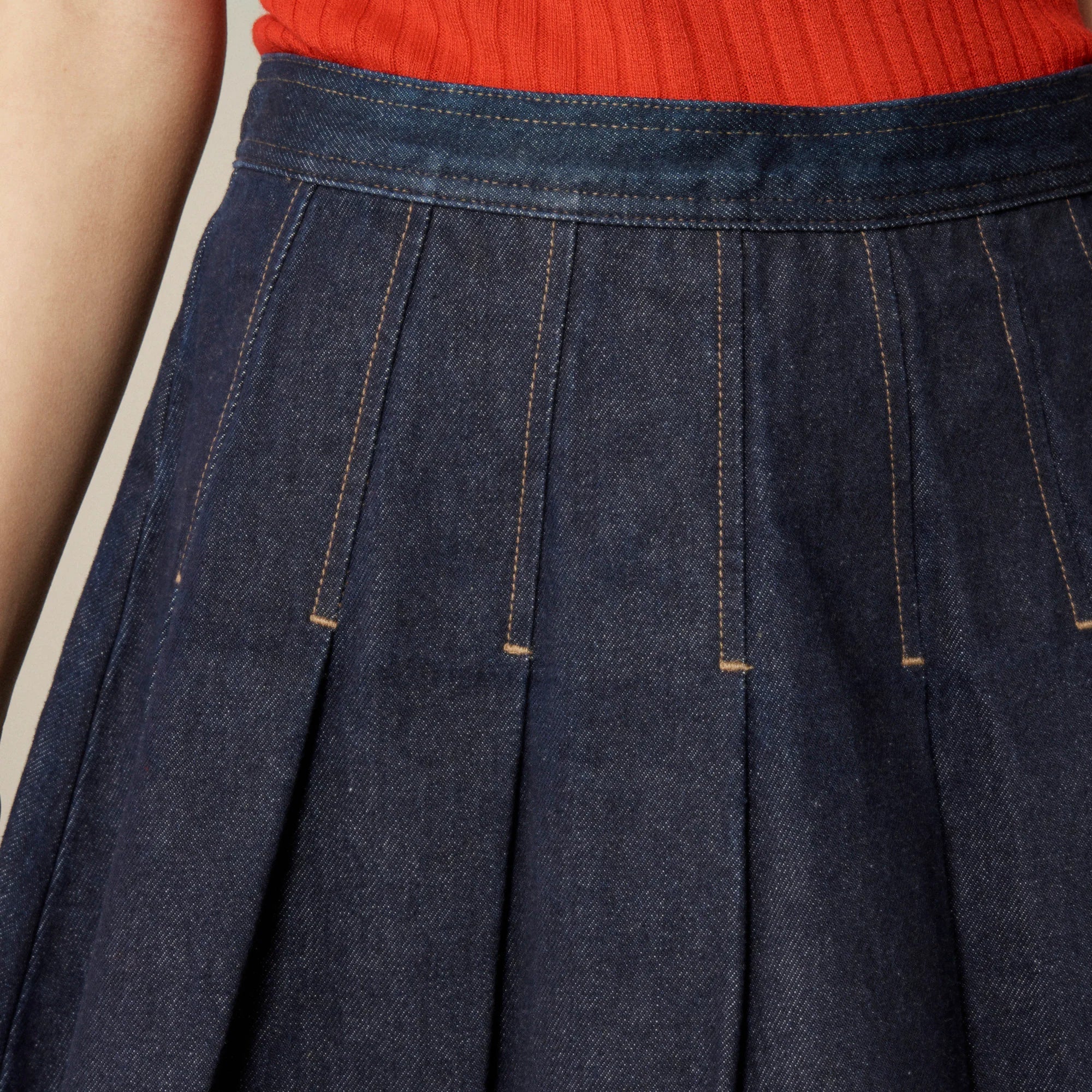 Every closet needs a classic denim mini. . . This one comes with plenty of pleats for all the prep-inspired vibes and pops of subtle contrast stitching.