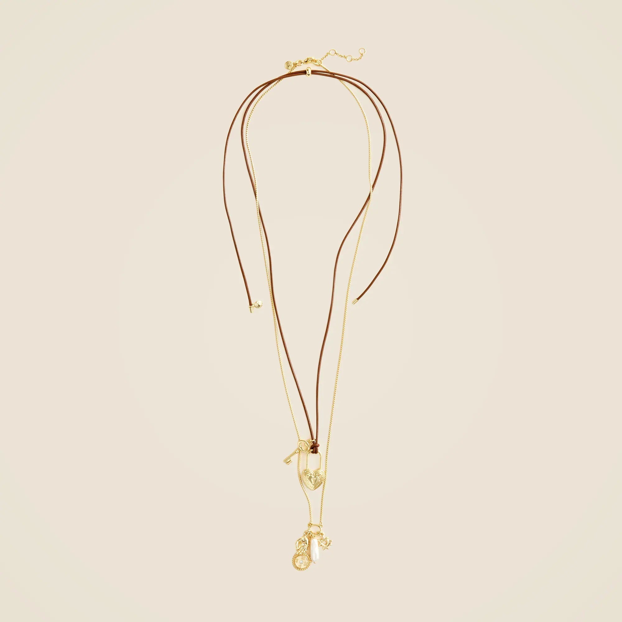 A necklace set with all the charm(s). This set-of-two is strung with a mix of romantic motifs—each one a tiny statement on its own. Bonus: Because we love options, this leather-cord style also features a pull-tie closure to adjust the fit. Want to keep your jewelry looking like new? We recommend removing it before showering or exercise and putting it on after applying hair products or perfume. To clean your pieces, polish them with a soft, dry cloth—and when not wearing, store them in a pouch or jewelry case.