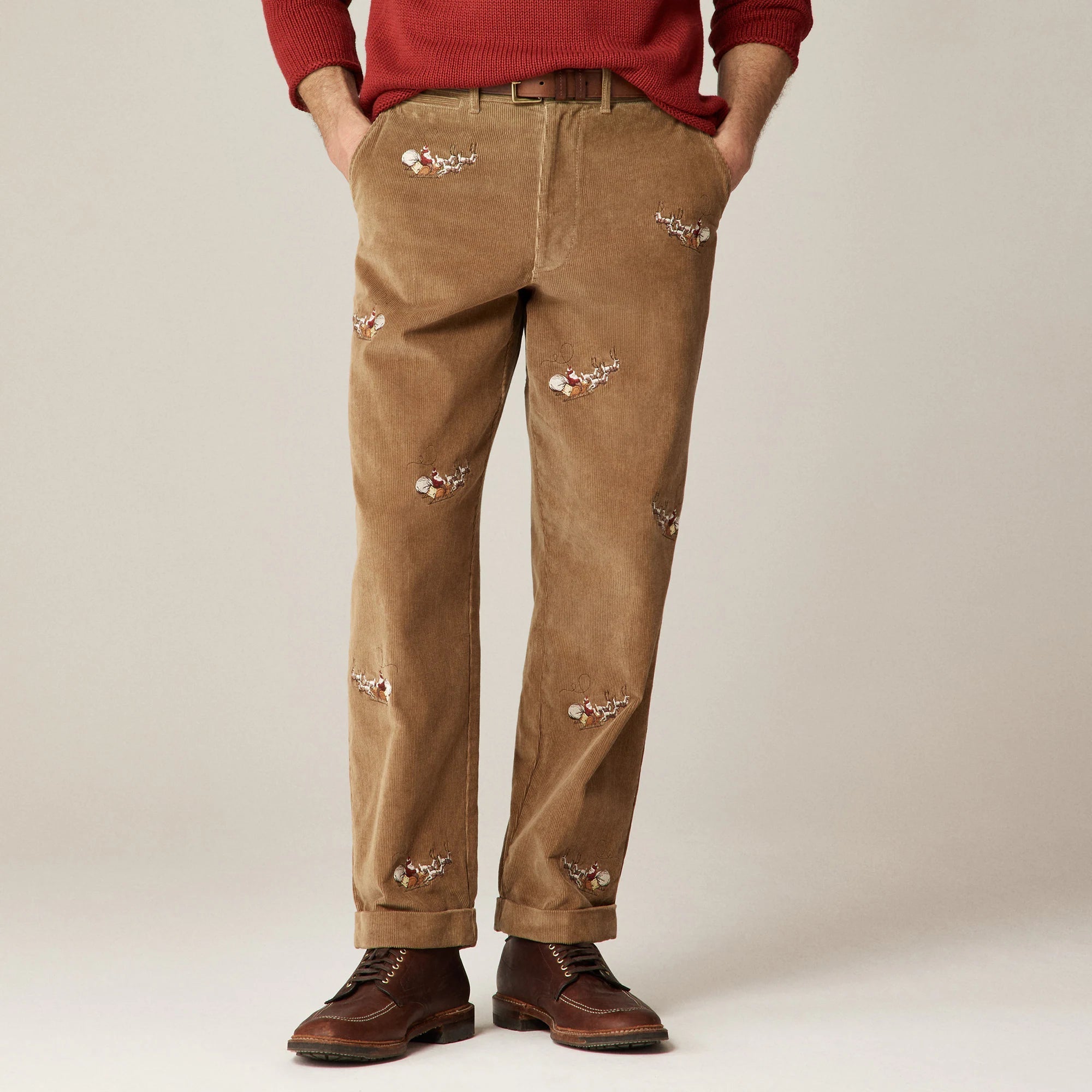 A nod to vintage J.Crew classics. These festive pants are crafted in 12-wale corduroy (translation: a traditional cord texture with 12 ridges per inch). Made from 100 percent cotton, they're finished with back flap pockets, affixed cuffs and an easy fit all the way through. The best part? An allover embroidered Santa motif that makes them an instant conversation starter.