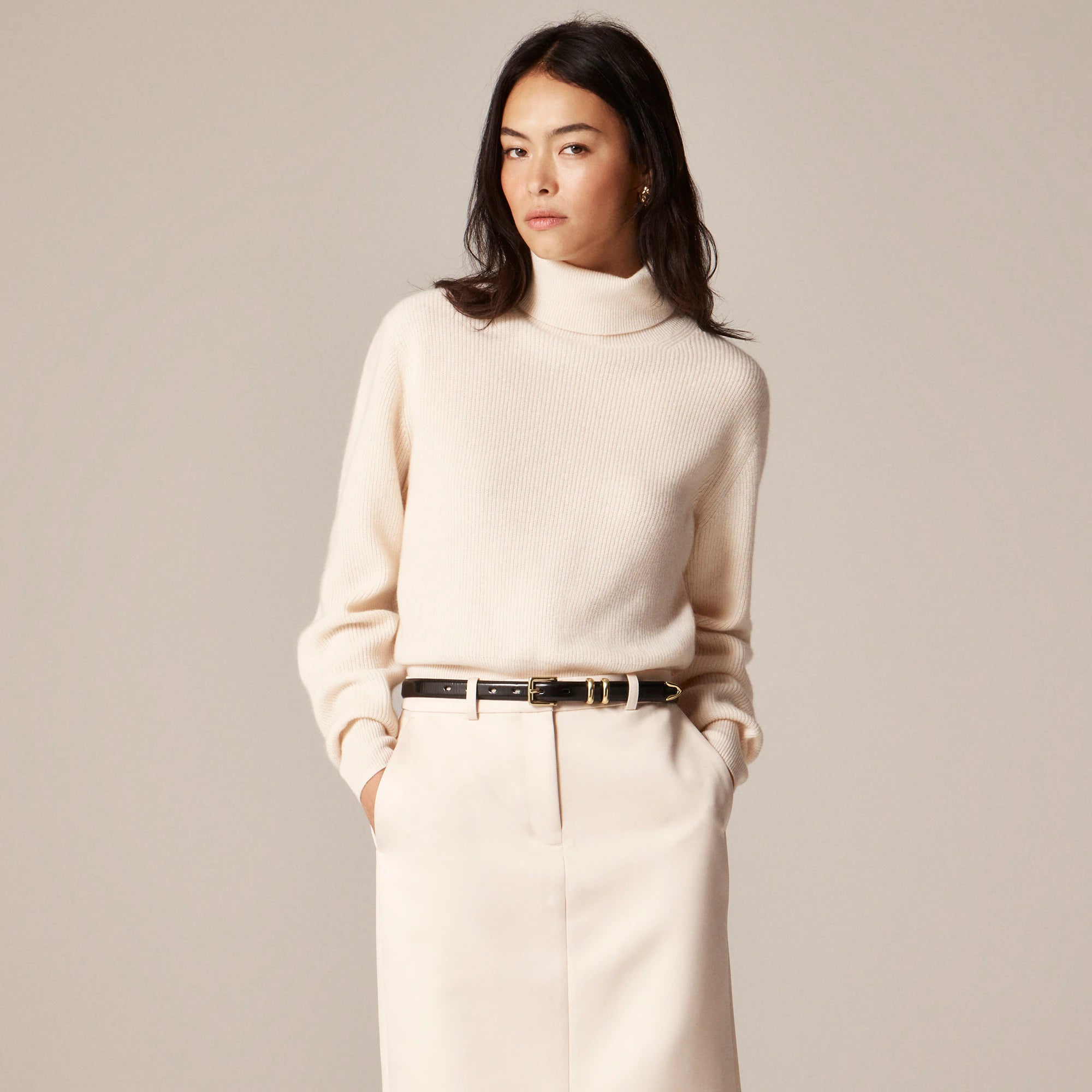 When it comes to quality, no one does cashmere quite like we do. With a cinched waist and a relaxed fit everywhere else, this sweater strikes the perfect balance between ease and structure. The foldover turtleneck adds an extra layer of warmth, while the finely ribbed texture adds visual depth. Basically, it's the softest, most luxurious way to keep warm.