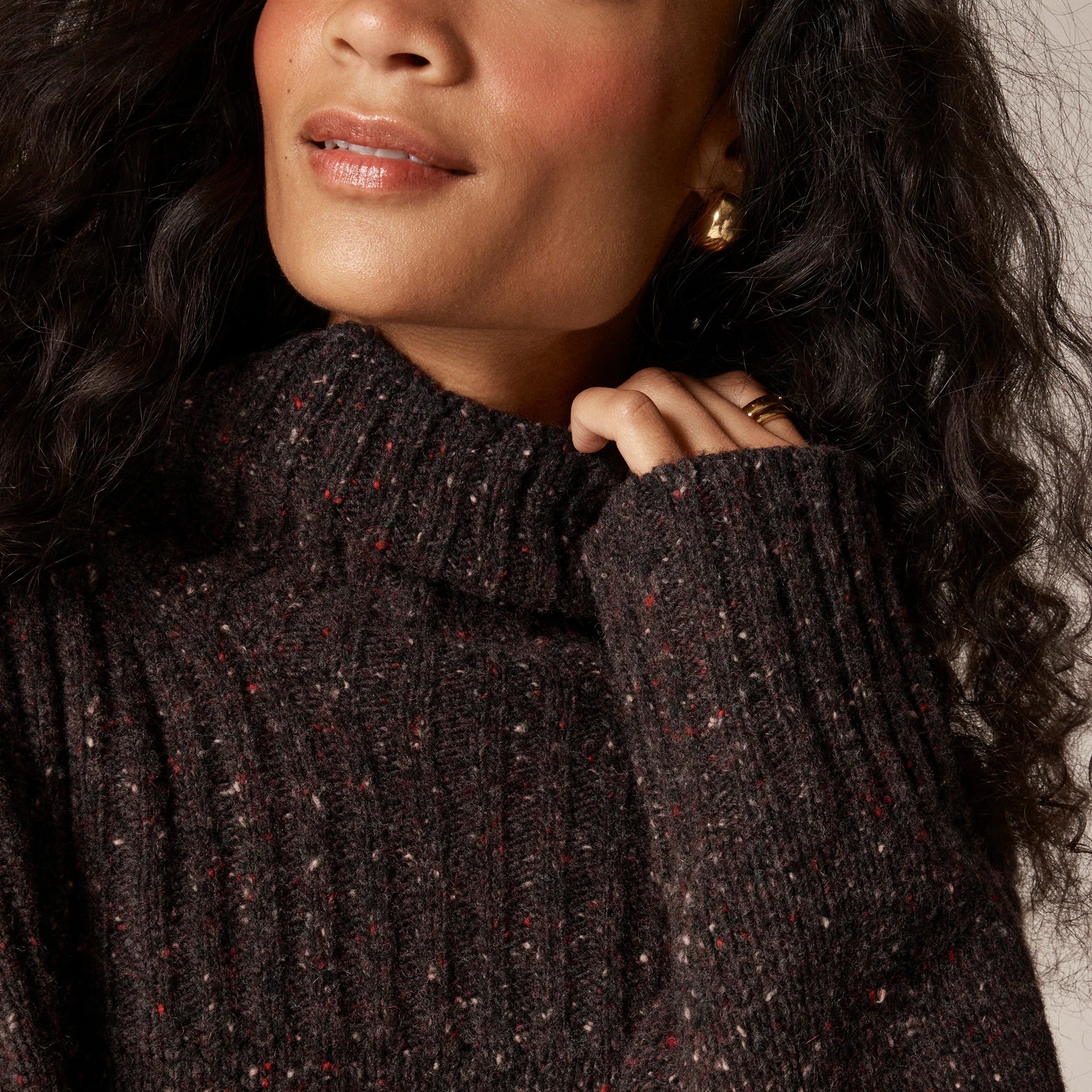 When it comes to cold-weather classics, this one tops our list. We love the oversized fit and soft wool blend that's crafted with flecks of tonal thread throughout for a donegal effect. It's finished with an exaggerated stand-up turtleneck, refined rib detailing up top and our signature roll along the hem.