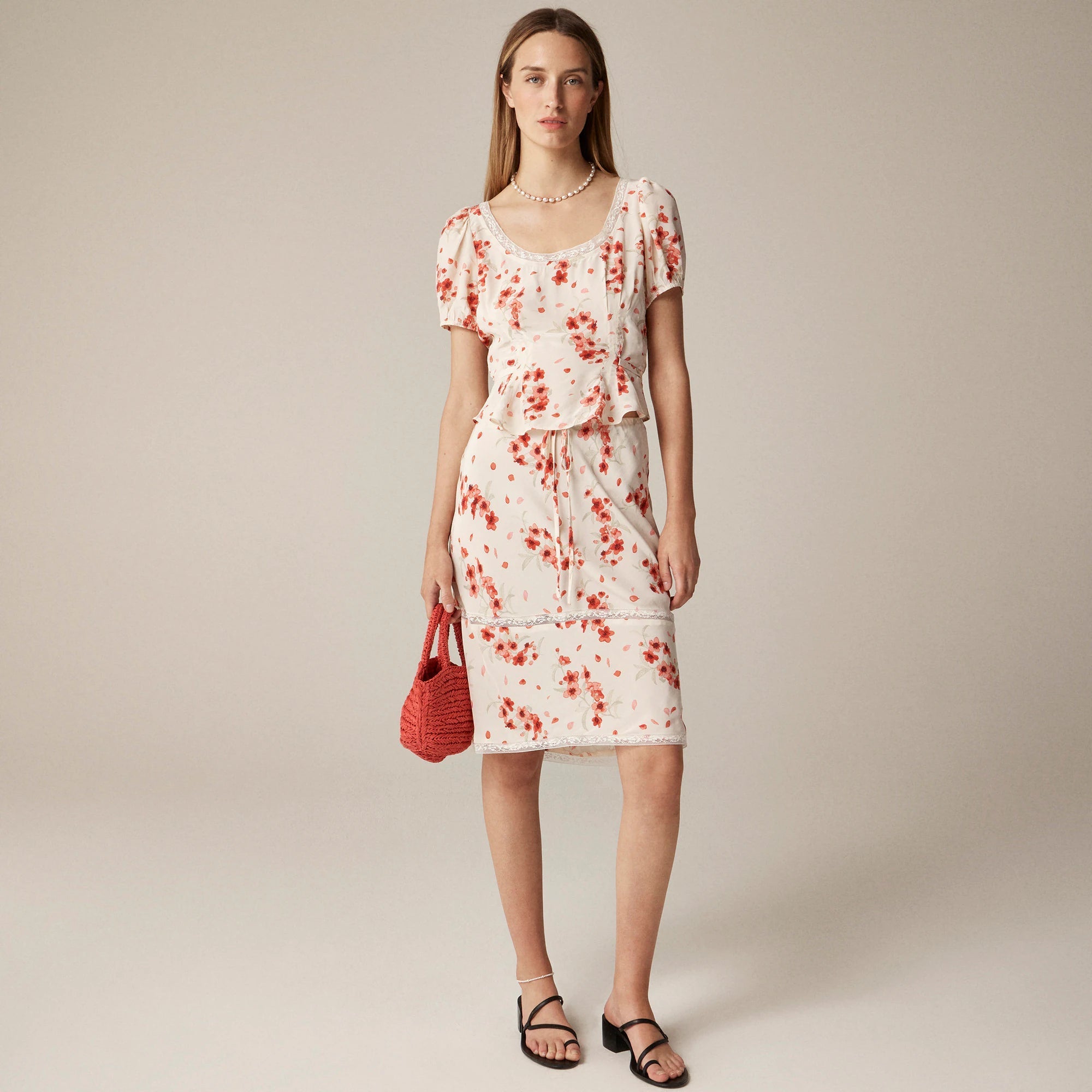 Paris meets New York. Rouje meets J.Crew. We collaborated with the Parisian brand on an exclusive capsule of romantic '90s-inspired pieces—all with a certain je ne sais quoi. Crafted from our drapey crepe de chine in a vintage-inspired floral print, the Poème skirt sits at the waist and falls to the knee. A flattering, swingy silhouette with delicate lace panels is perfect for flower markets and bike rides home. We love it even more paired with the matching top.
