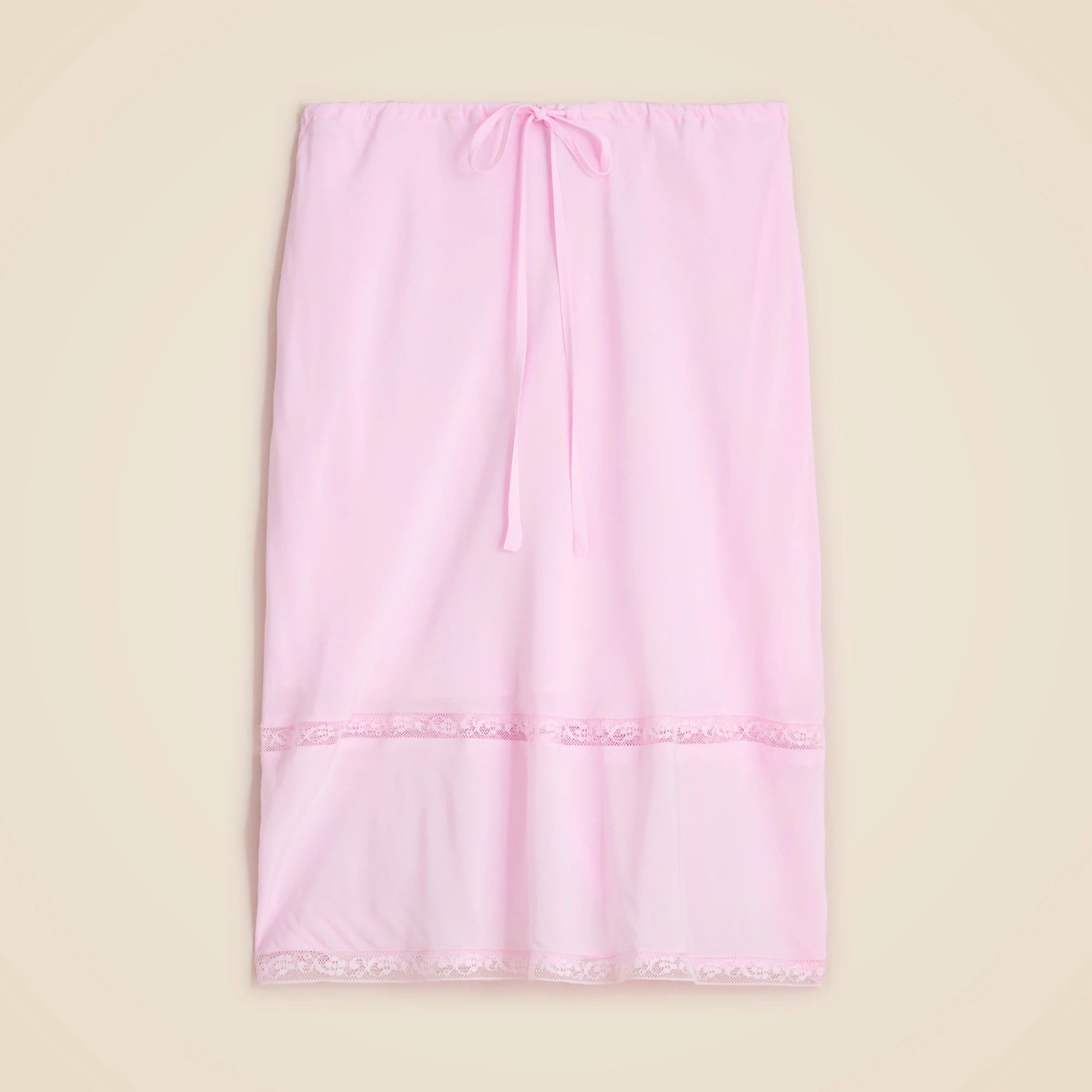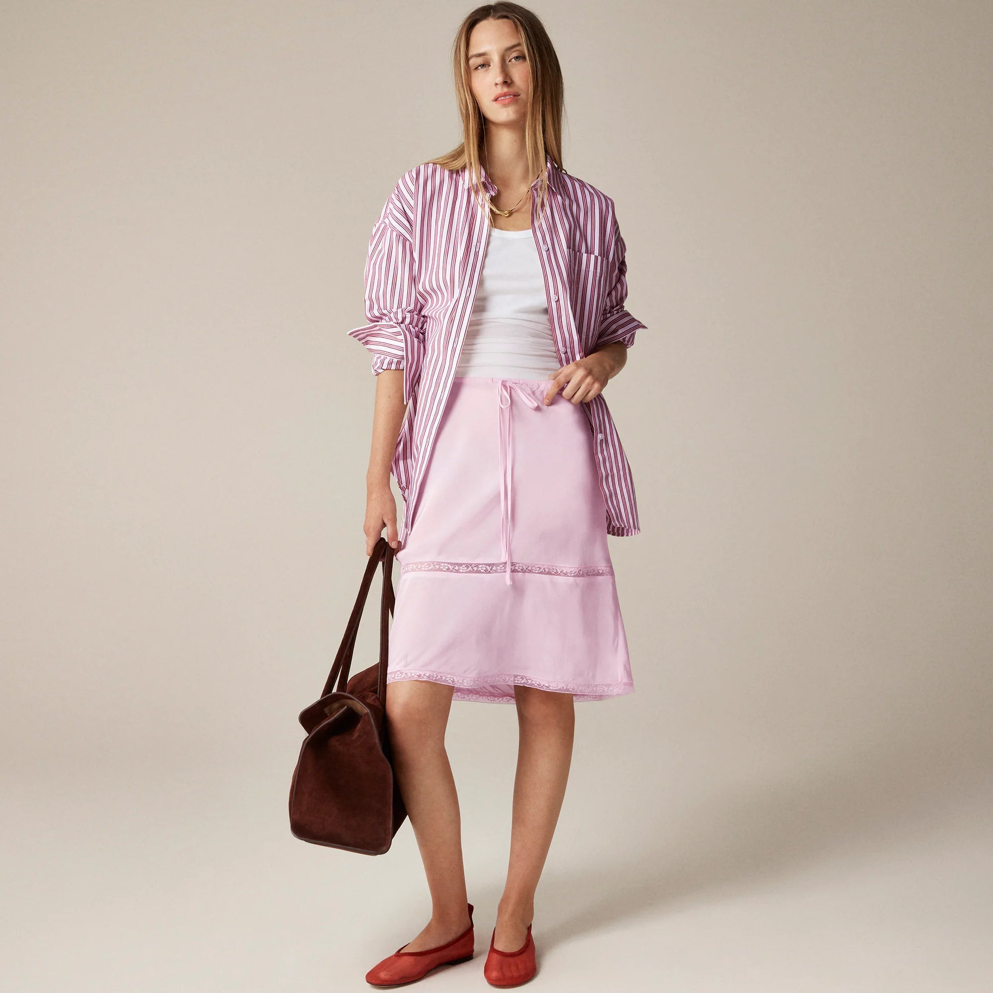 Paris meets New York. Rouje meets J.Crew. We collaborated with the Parisian brand on an exclusive capsule of romantic '90s-inspired pieces—all with a certain je ne sais quoi. Crafted from our drapey crepe de chine, the Poème skirt sits at the waist and falls to the knee. A flattering, swingy silhouette with delicate lace panels is perfect for flower markets and bike rides home. We love it even more paired with the matching top.