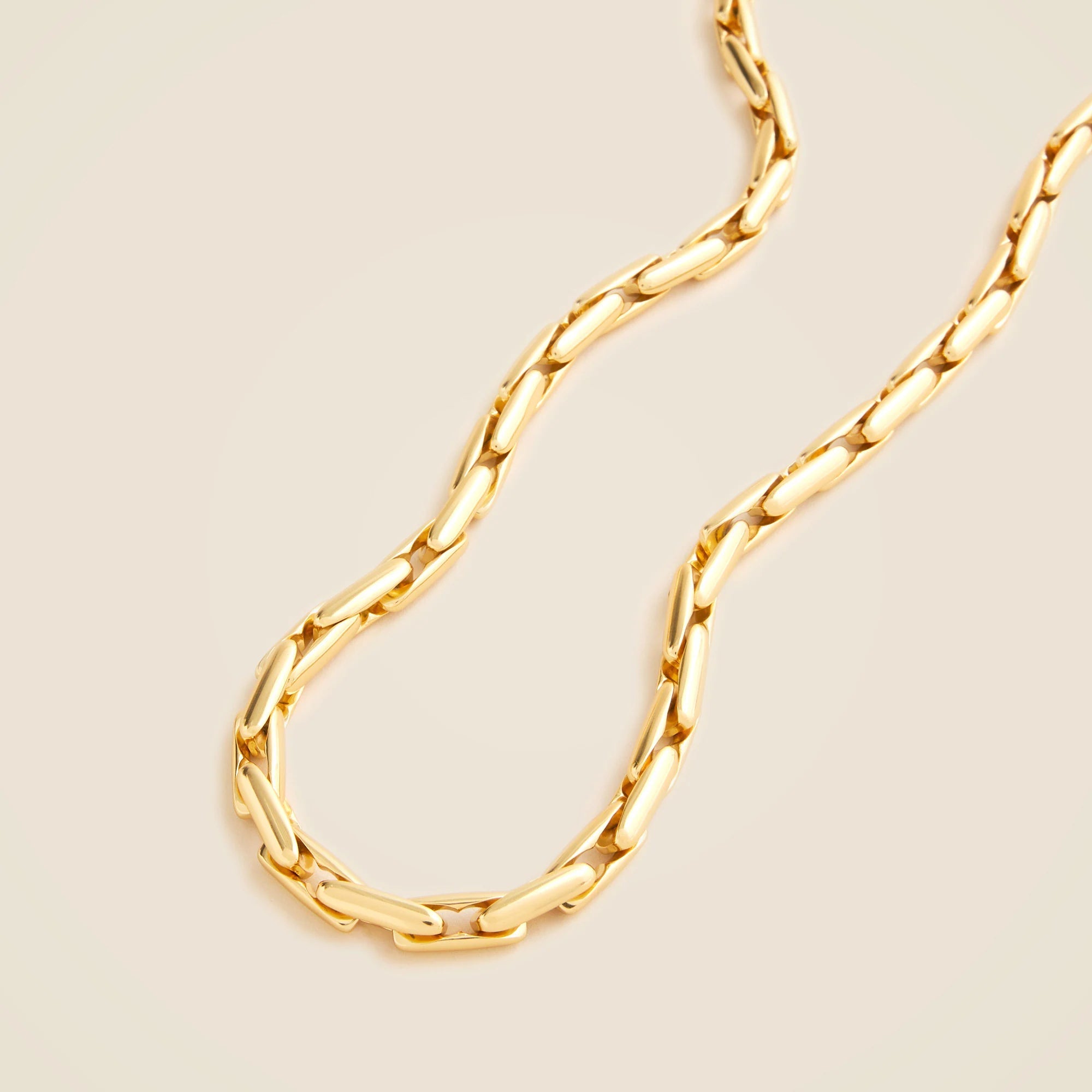 A polished update to the classic chain necklace. This collar-length style features softly curved, elongated links for a sleeker silhouette. P.S. It looks great layered with all of your favorites. Want to keep your jewelry looking like new? We recommend removing it before showering or exercise and putting it on after applying hair products or perfume. To clean your pieces, polish them with a soft, dry cloth—and when not wearing, store them in a pouch or jewelry case.