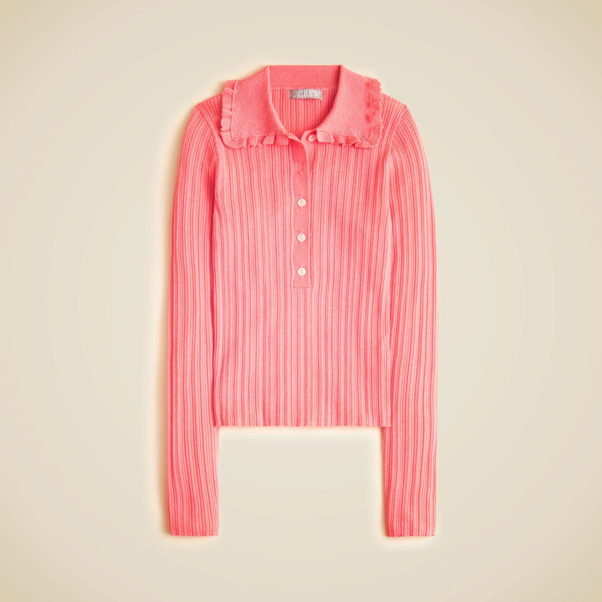 Calling all frill seekers. . .This slim-fitting style comes with a playful ruffle collar, a comfortable ribbed texture and a few buttons down the front. Plus, it's crafted from smooth 100 percent merino wool, so it's warm enough to wear on its own now and light enough to layer later.