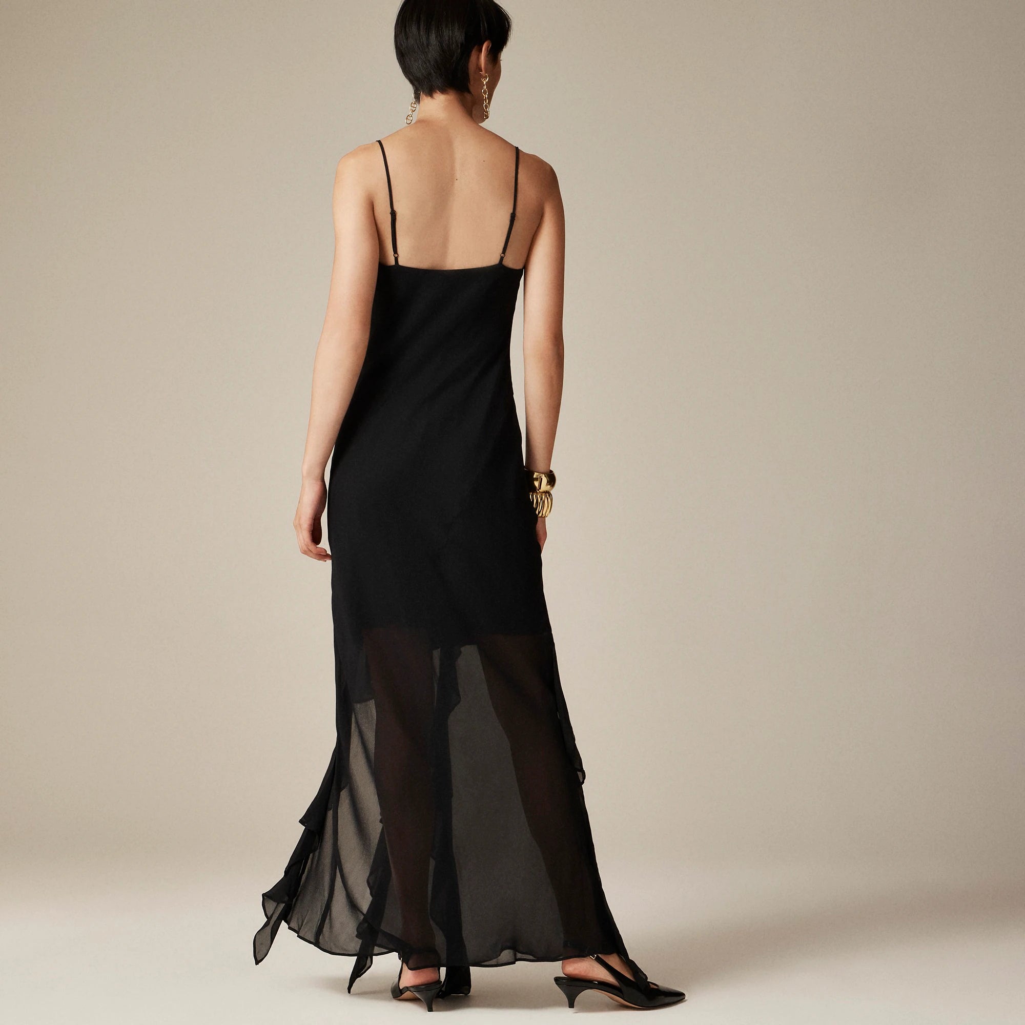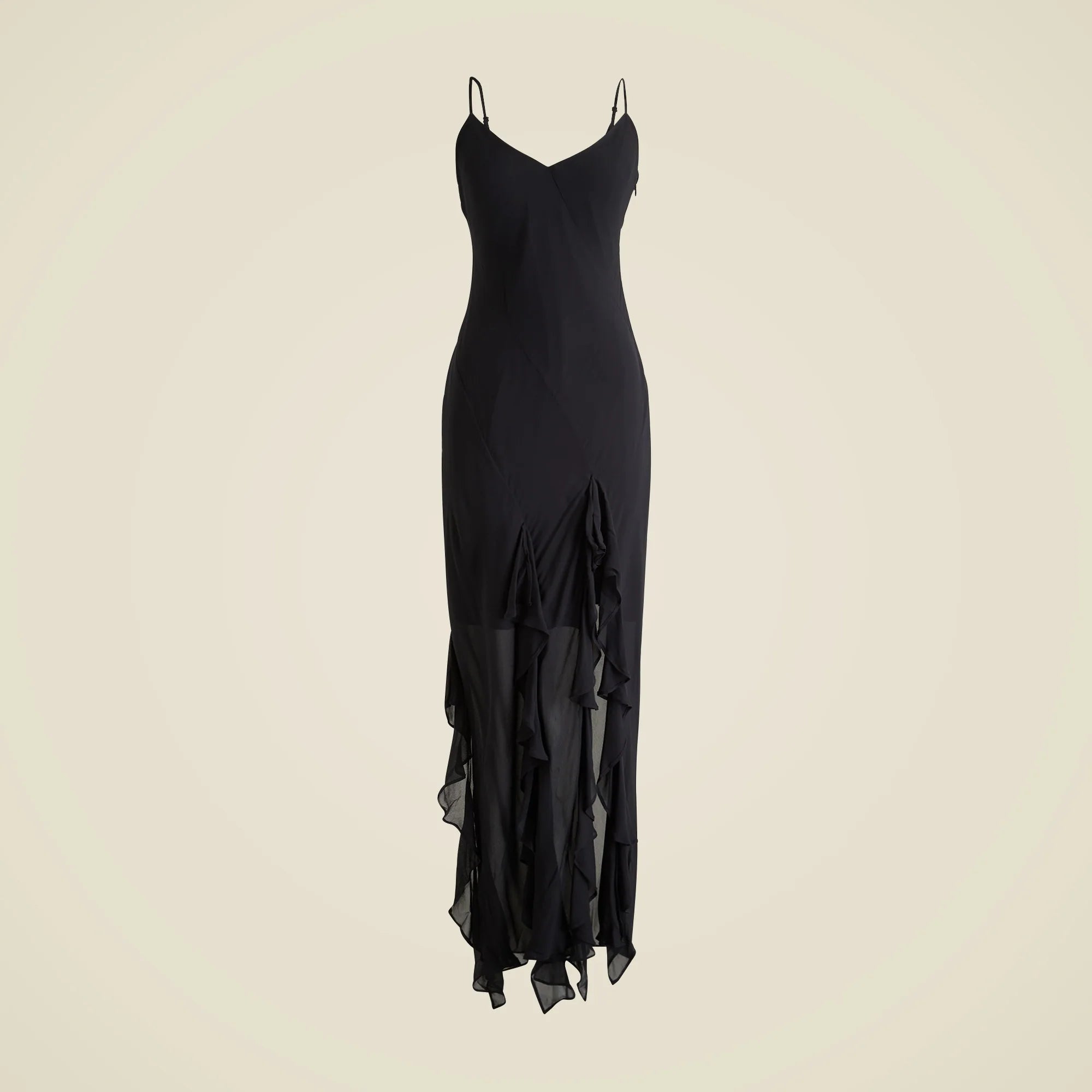 Dress(ed) to impress. Be black tie-ready, thanks to this floor-length slip dress crafted in sheer chiffon fabric, featuring diagonal seams and cascading ruffles down the front for a fabulous and flattering effect.