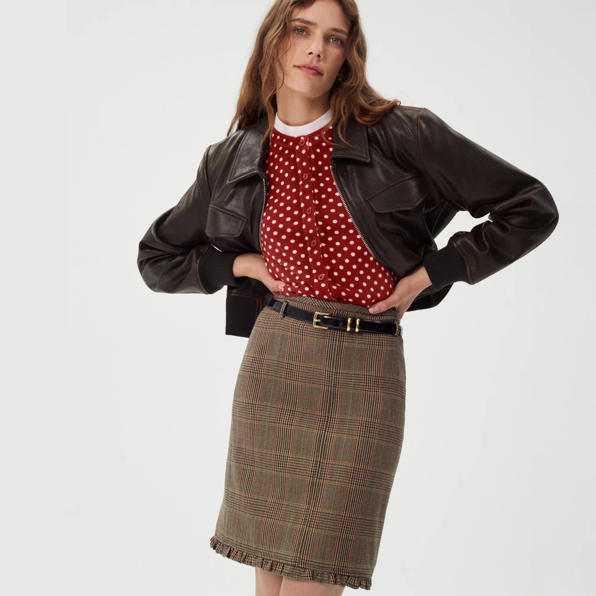 A sleek silhouette with playful details. This modern take on the classic pencil skirt comes with a slit at the front for ease of movement, ruffle trim along the hem and a comfortable midi length. Plus, it's crafted from soft wool in a prep-inspired plaid pattern. In other words, it's designed to keep up with everything on your schedule, from office hours to after-hours.