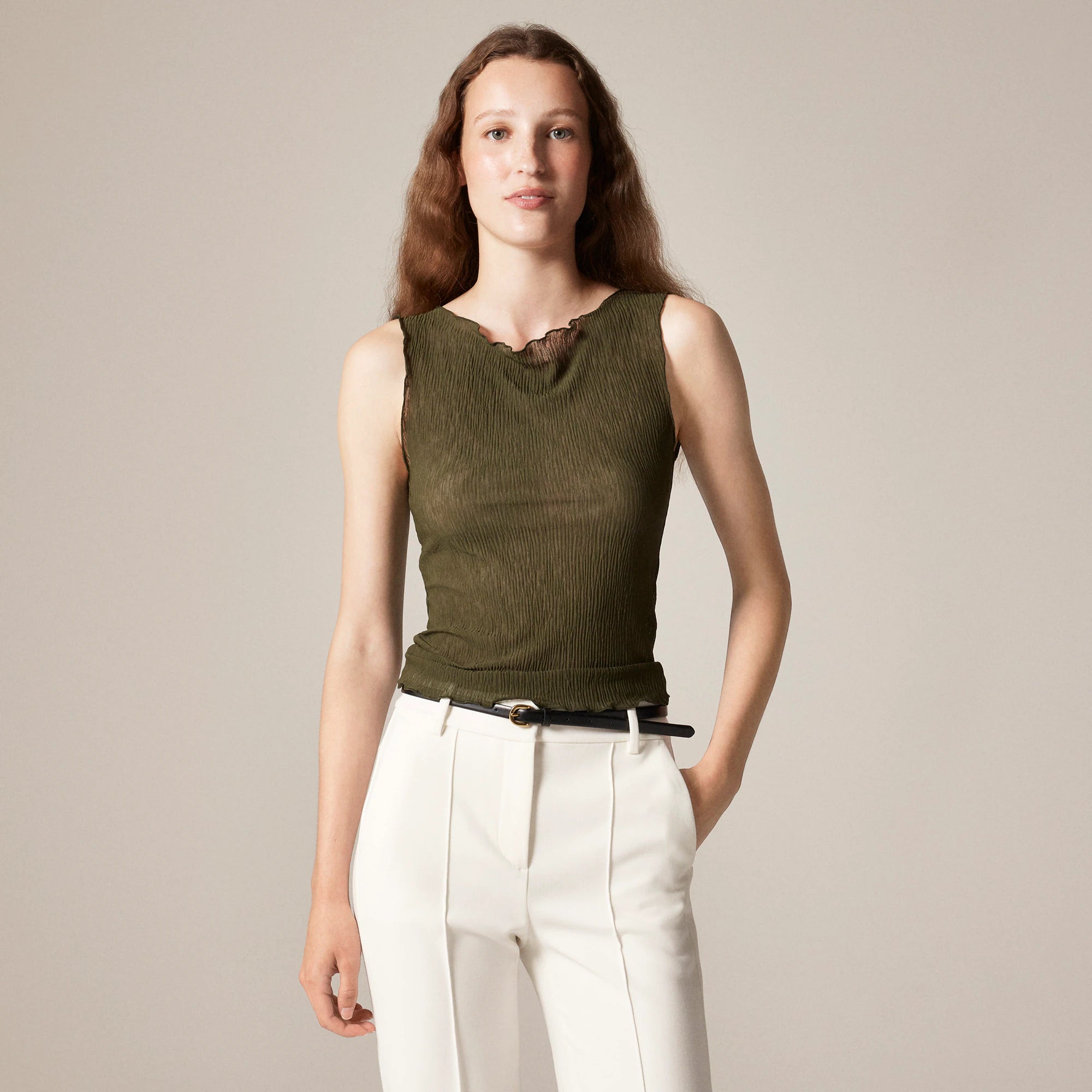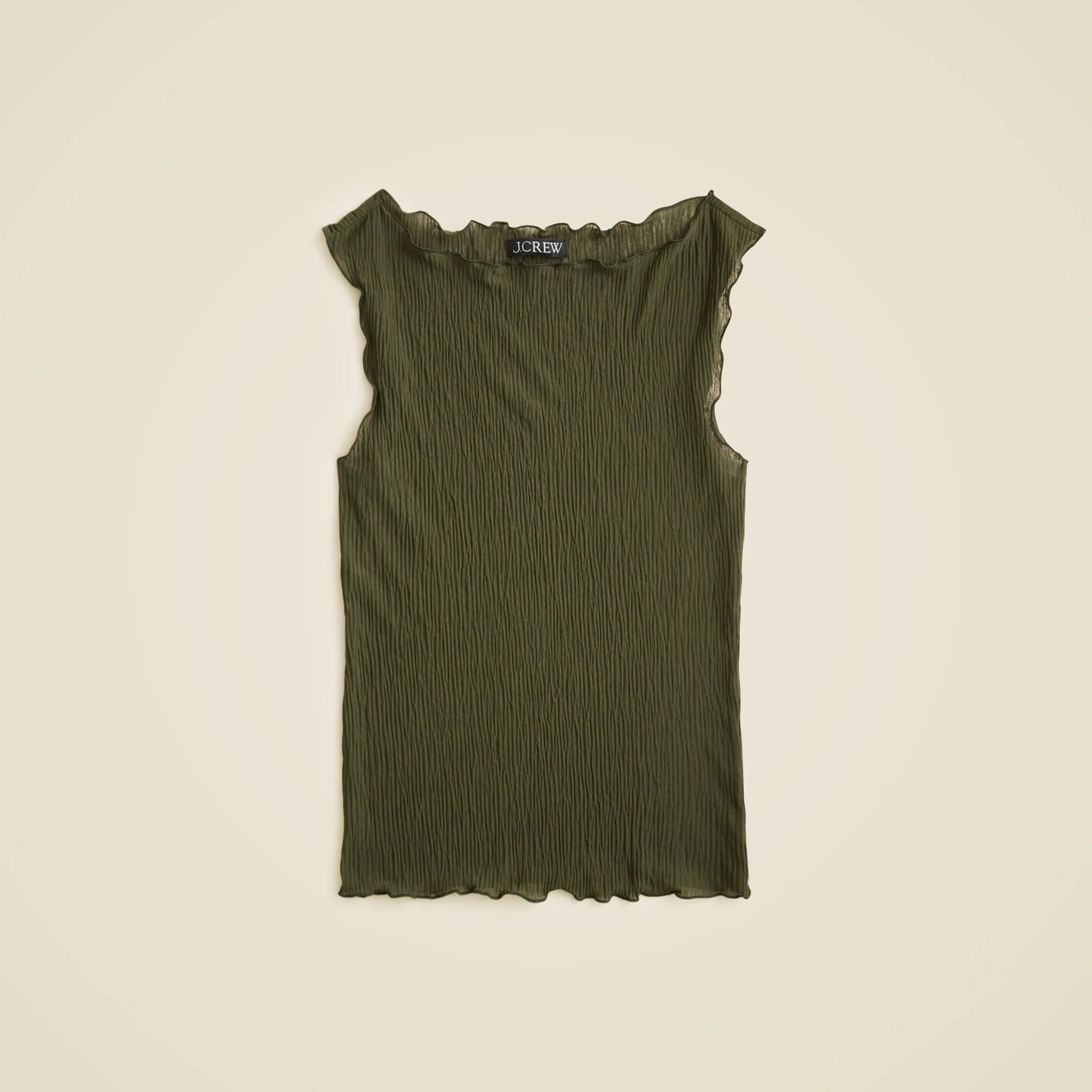 A sophisticated take on the classic tank. This textured style is knit from a new sheer, precrinkled fabric that's airy and lightweight. Finished with a delicate ruffle trim for a feminine touch, the clean, sleeveless silhouette keeps things polished with a hint of play.