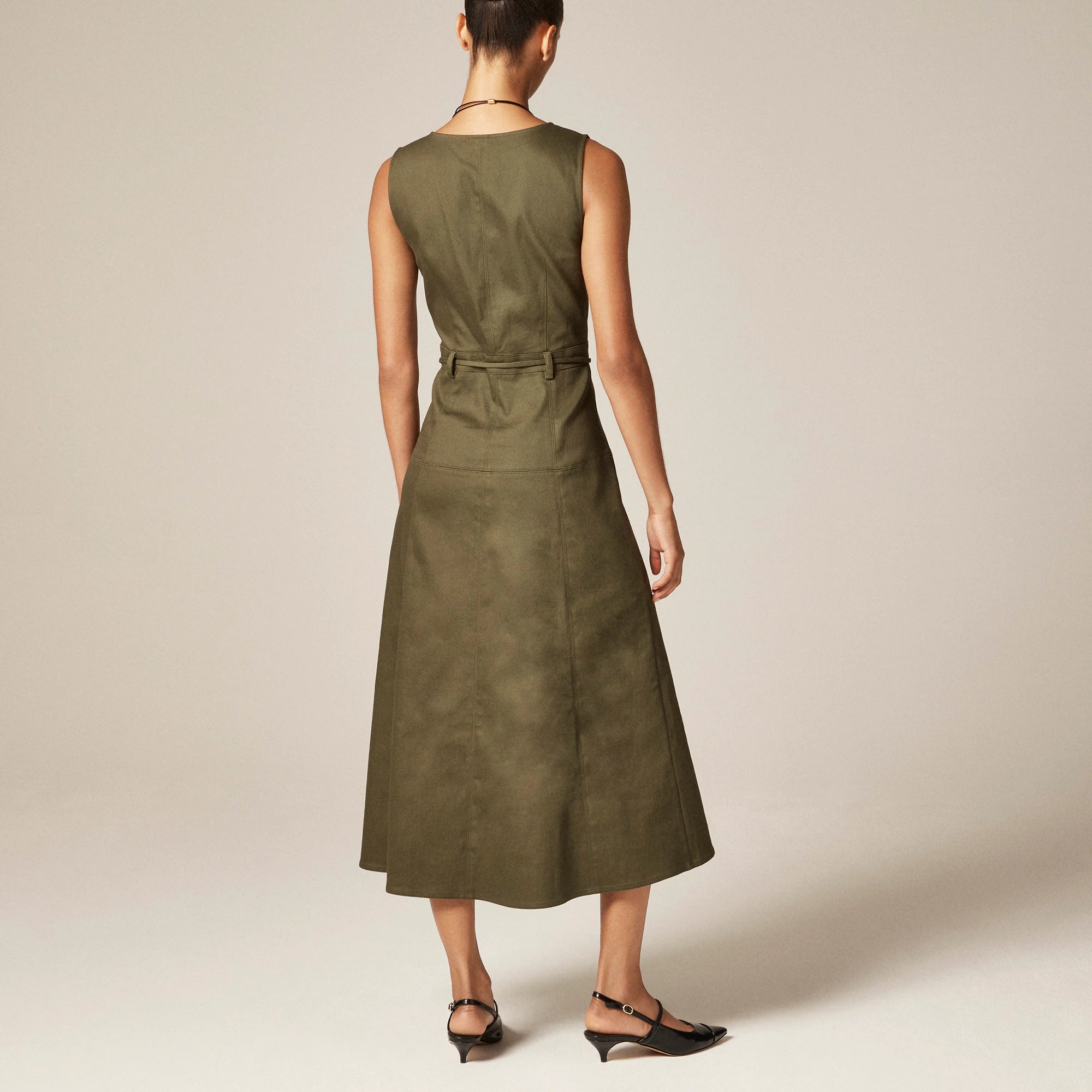 Clean lines meet everyday ease. This sleeveless silhouette melds structure and softness in all the right ways. It comes with a flattering V neckline, panel seaming and a gently flared skirt. Plus, the adjustable tie belt lets you cinch the waist just how you like, while the tailored twill fabric adds texture and shape.
