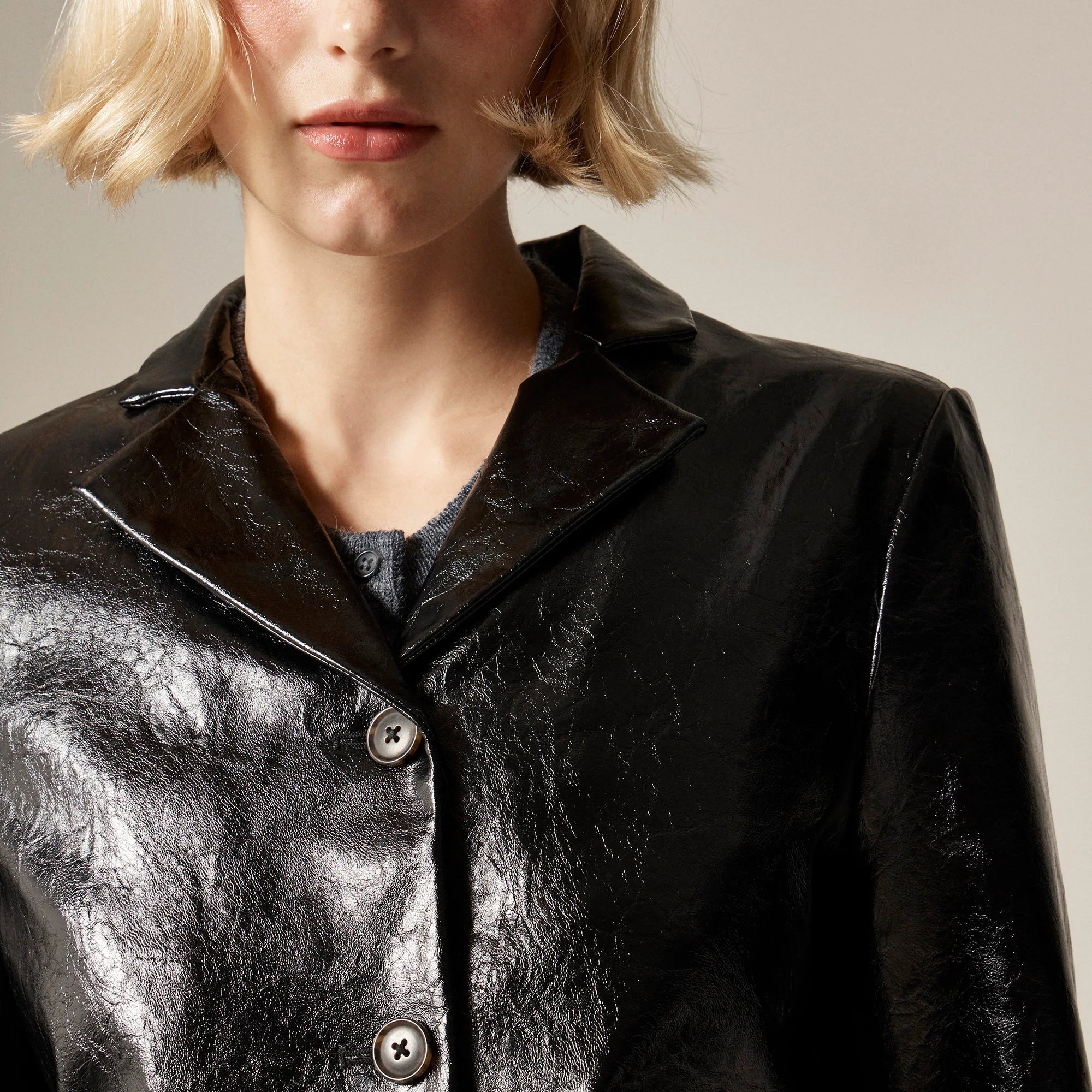 A light layer in faux crackled leather. Despite the blazer-like look on the outside, this shirt is a light layering piece, made with faux crackled leather and covered buttons.
