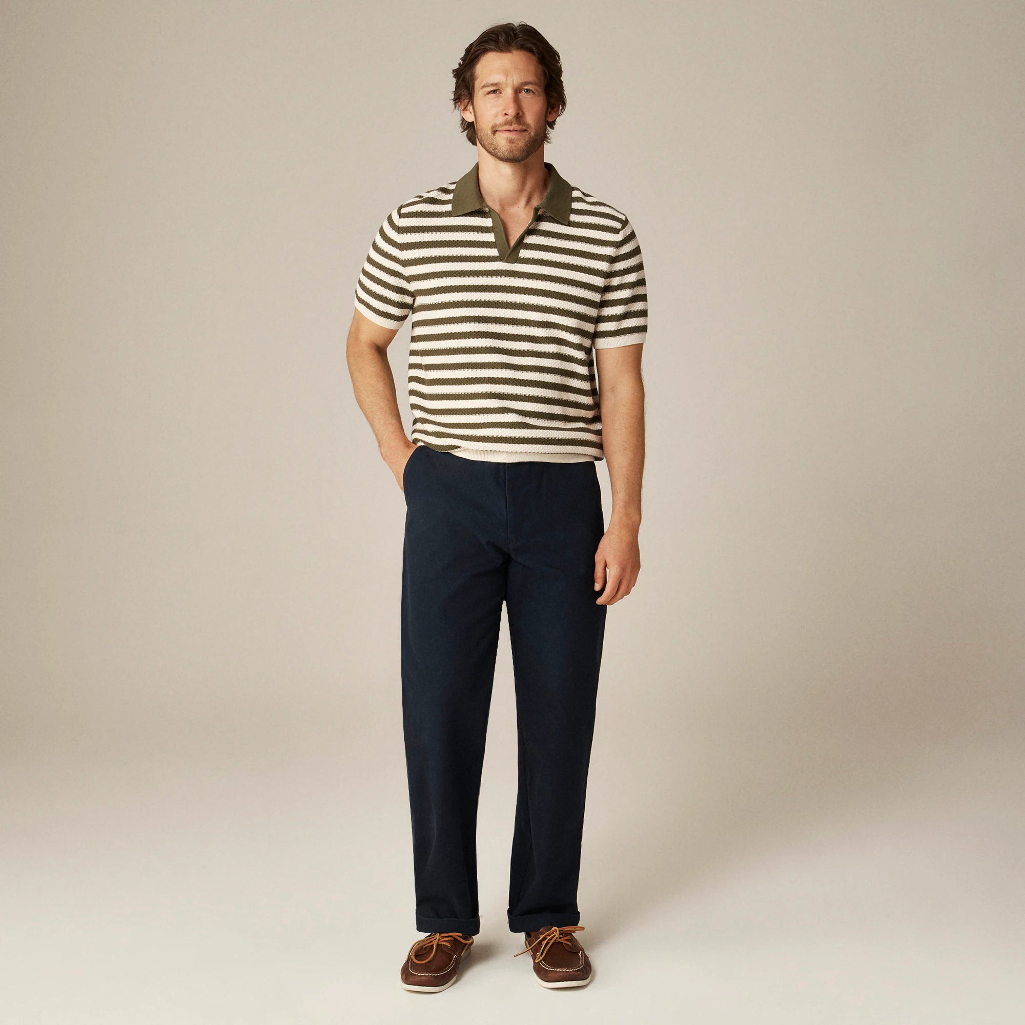Short-sleeve textured-stitch cotton johnny-collar sweater-polo in stripe