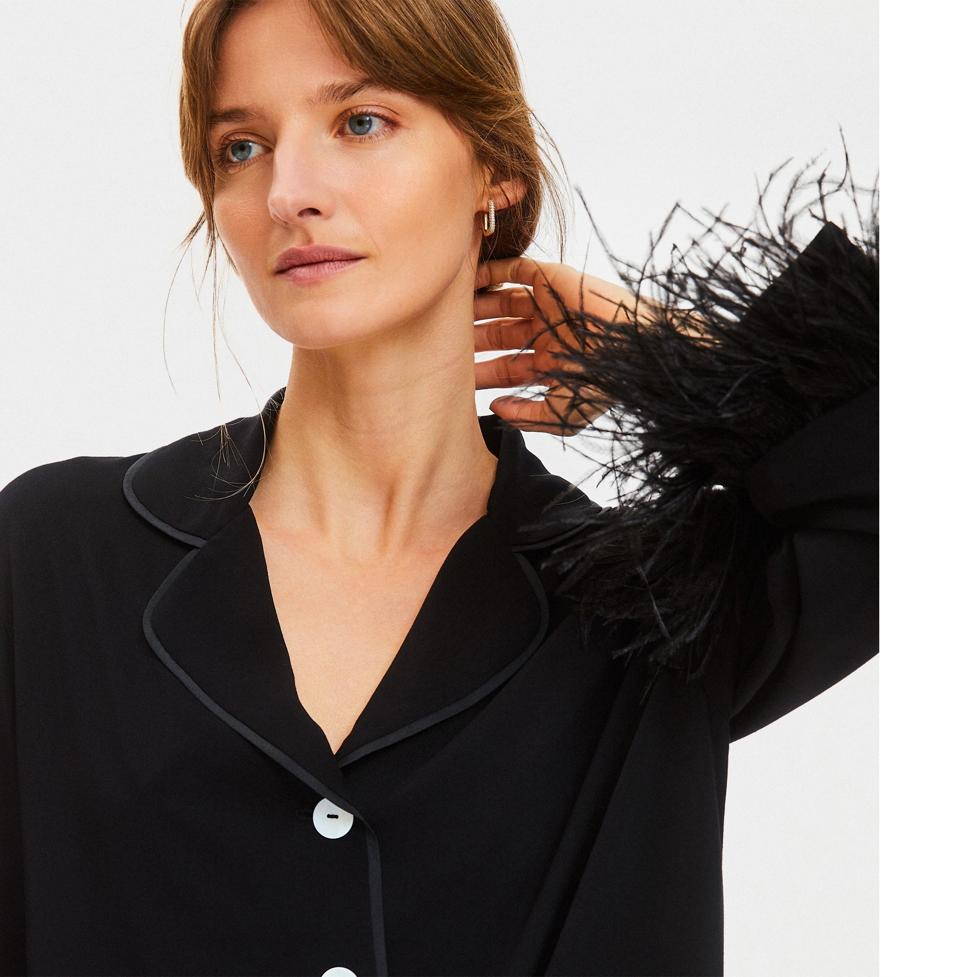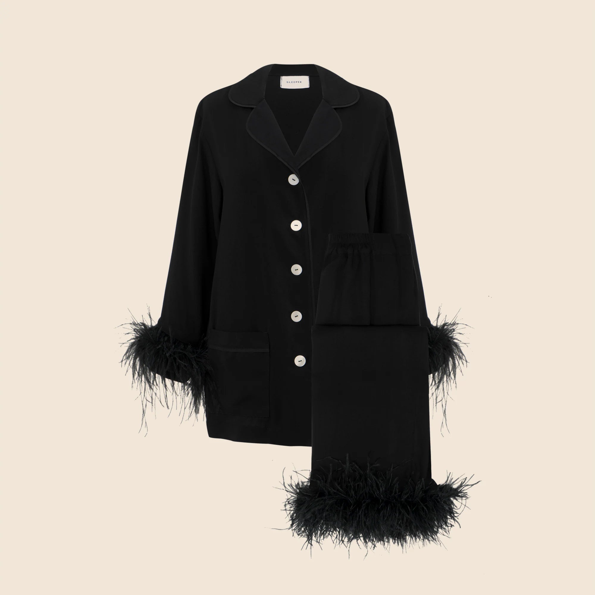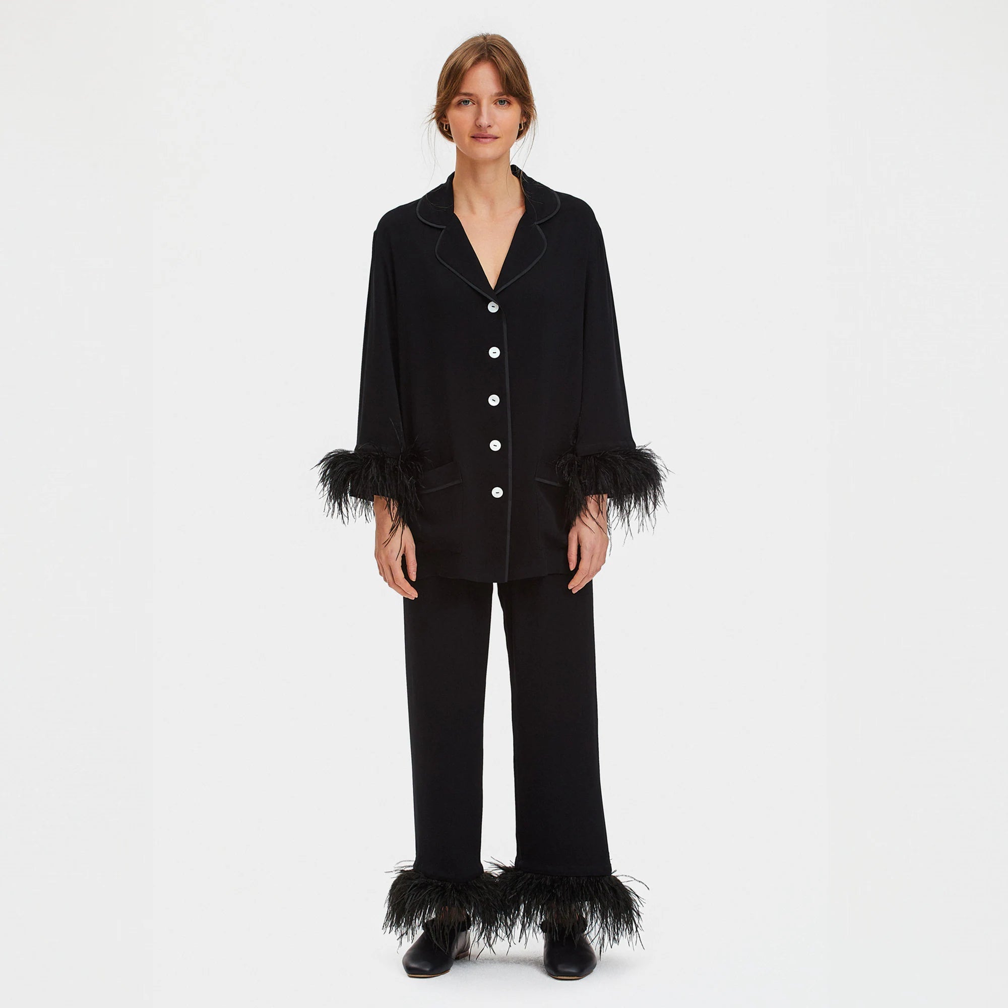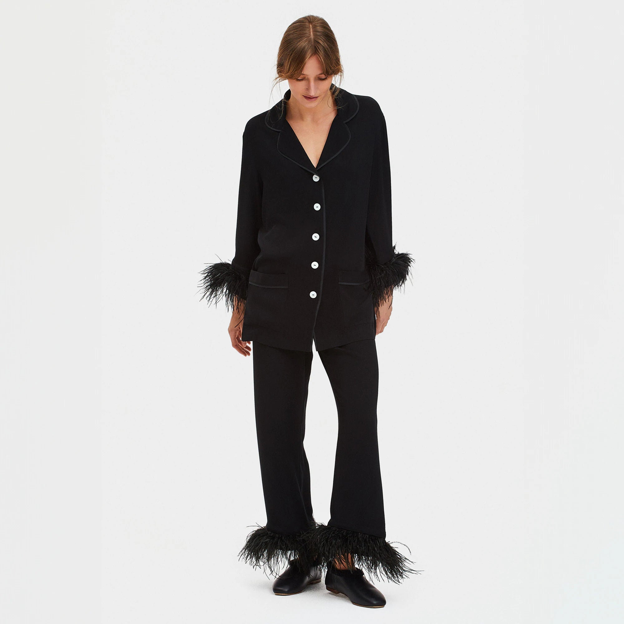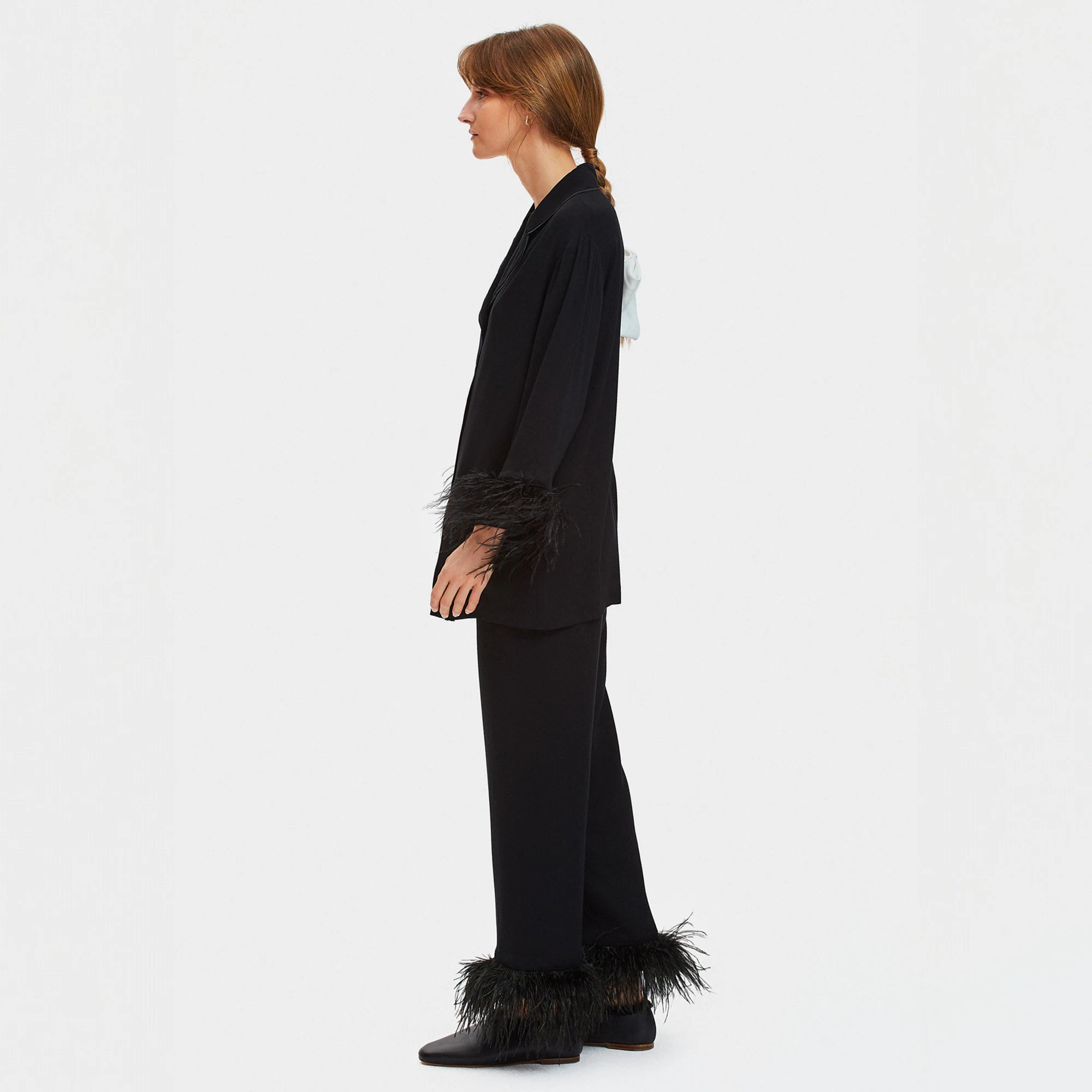 Sleeper is a niche easy-to-wear brand that re-imagines loungewear. Born in 2014 in Kyiv from a collection of daytime pajamas, they gained recognition for pioneering the concept of "walking sleepwear," transforming traditional pajamas into stylish daywear suitable for everyday life. The signature SLEEPER party pajamas continue to be our best-selling style. A relaxed pajama shirt and pants set is cut from soft certified viscose, trimmed with a double layer of detachable ostrich feather cuffs. The shirt features a cropped sleeve length, as well as tonal piping at the round collar, button closure and pockets. The pants sit below the hip with a comfortable elastic waistband and straight silhouette. The set pairs just as easily with slippers as it does with heels.