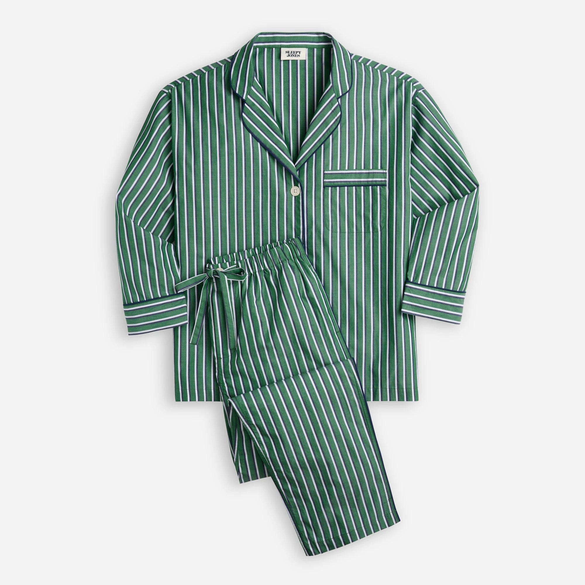 Sleepy Jones exists to help people rest and unplug—in order to reconnect—with ideas, creativity and with others. Our classic Marina pajama set is designed to be worn inside or outside of the bedroom. The top is comfortably oversized with a chest pocket and piping at the placket, cuffs and pocket. The pant has two side pockets, a button fly and an adjustable drawstring at the waist, plus slim piping along the outside seams. Made in a supersoft, fine cotton fabric.