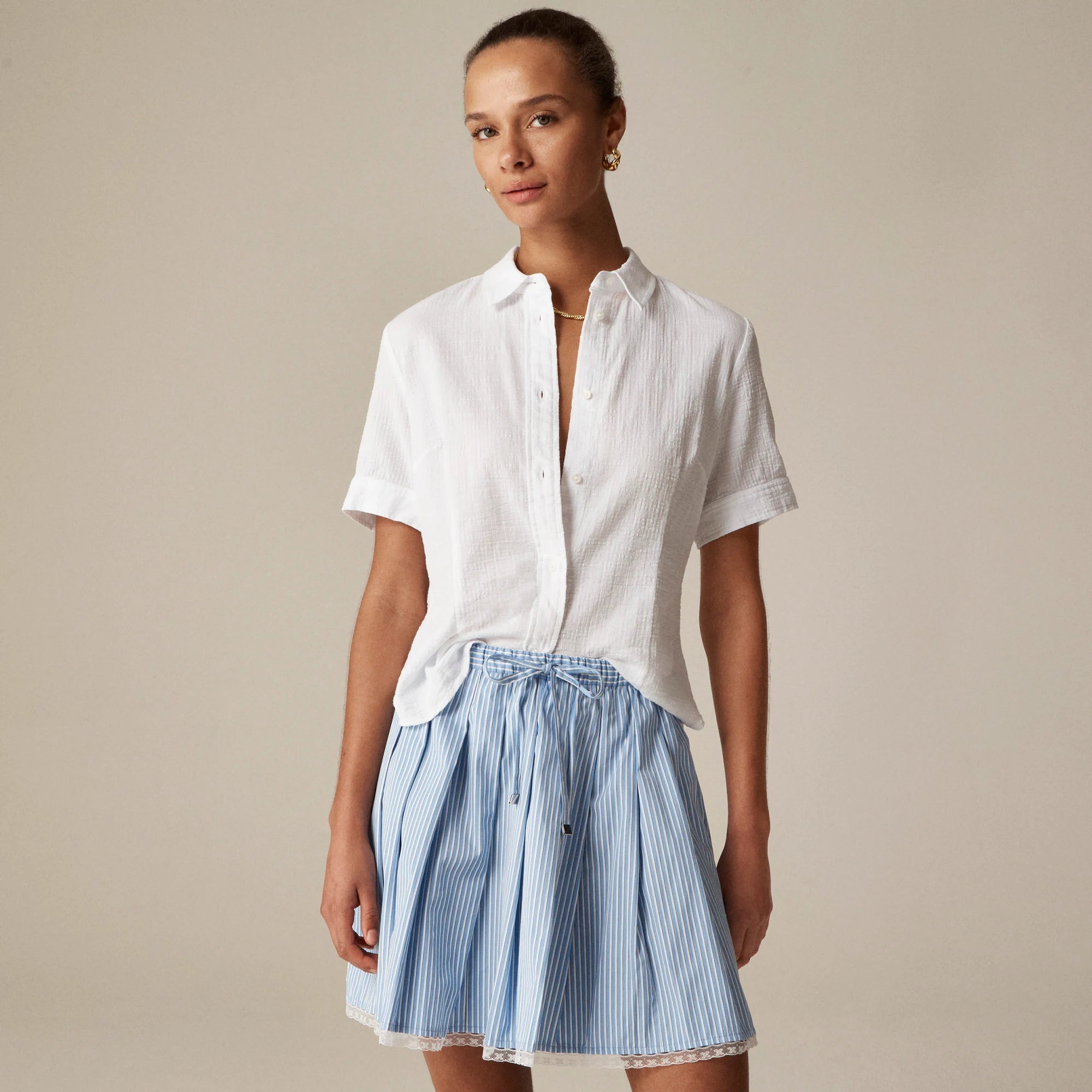 A summerweight take on the timeless button-up. Designed with cuff-sleeve details and a fit that sits a bit closer to the body, this easy style is crafted from breathable, subtly textured gauze fabric that's easy to dress up or keep casual.