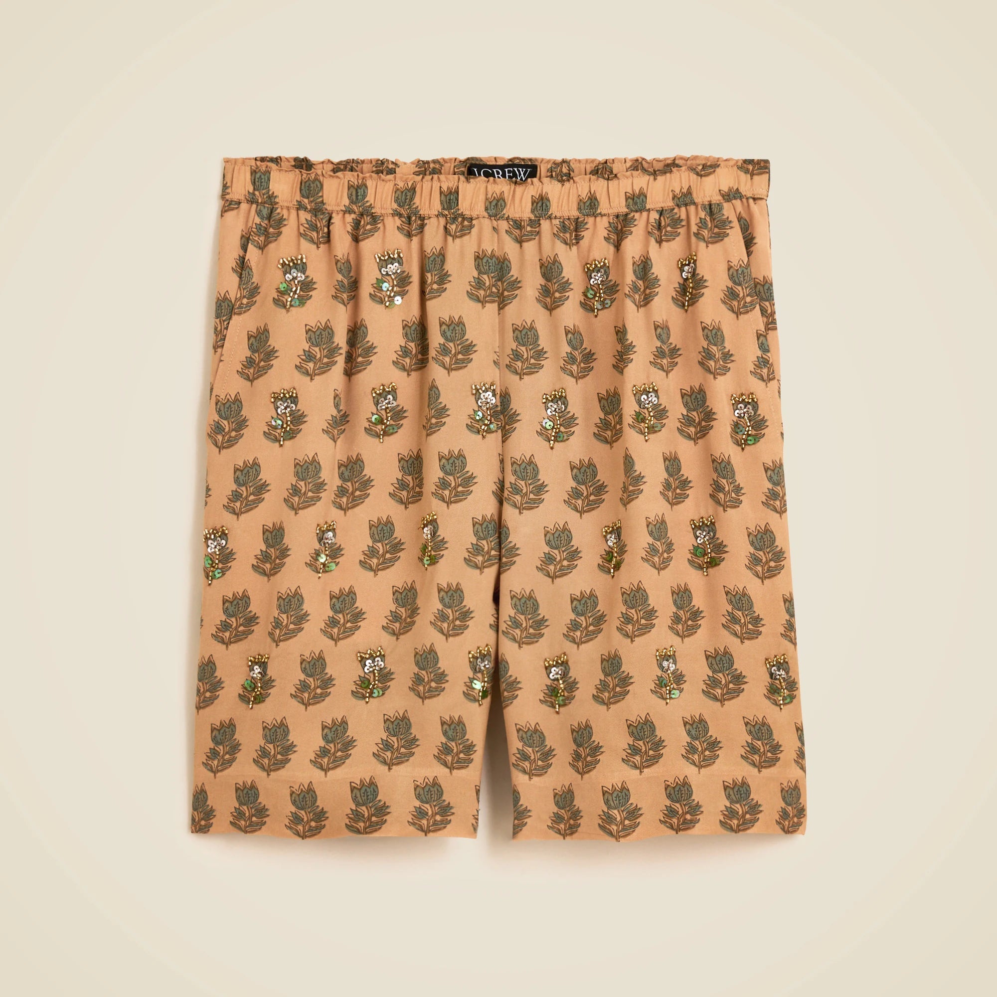 Our top-rated pair for everywhere, now in short form. With an easy elastic waistband, a relaxed fit that hits above the knee and pockets (!), this version is crafted from drapey viscose twill with a subtle sheen. The allover floral block print is finished with sequin accents for a soft shine that catches the light.