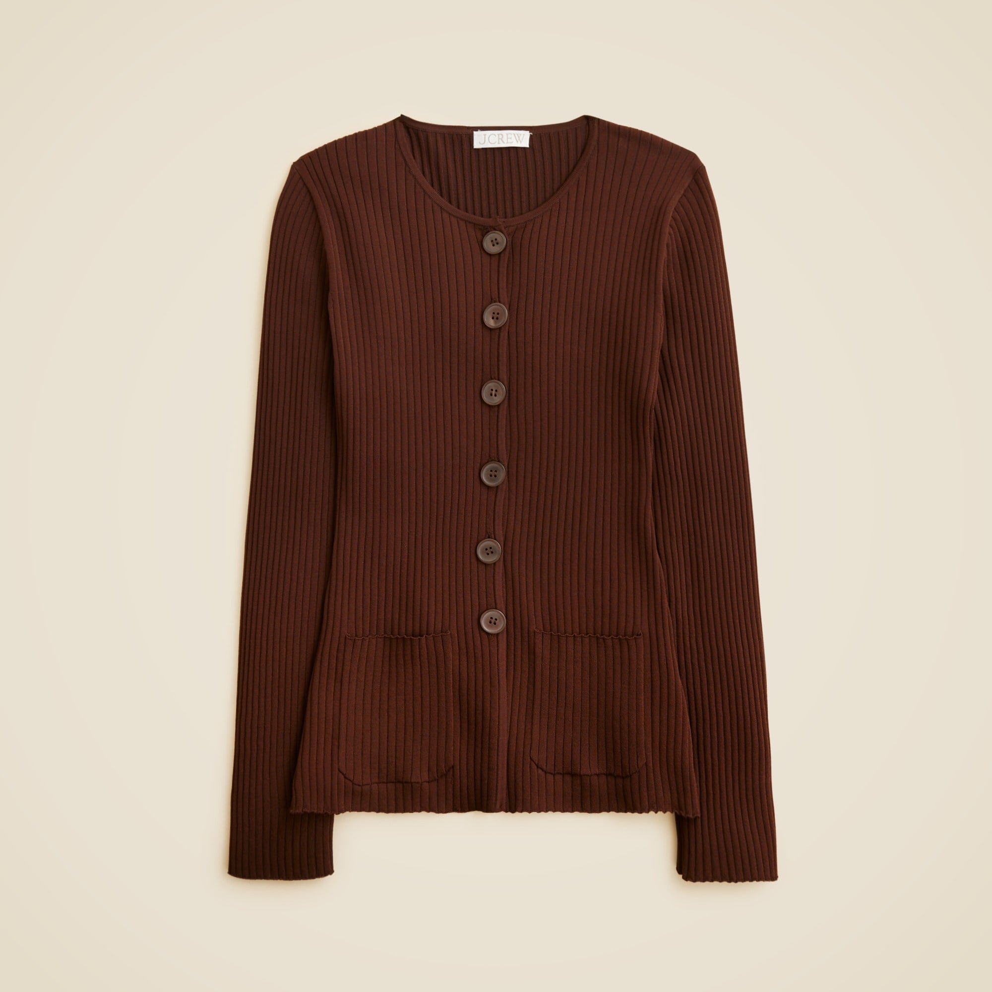 Sleek enough to stand alone. This isn't your standard cardigan—it's a streamlined button-up top knit in our luxe super-stretch yarn, known for its sleek drape and body-skimming fit. The fine vertical ribbing elongates the silhouette, while the hint of sheen and soft handfeel make it extra-luxe. Plus, it comes with slightly oversized tonal buttons and subtle front pockets that make for the perfect finishing touch.