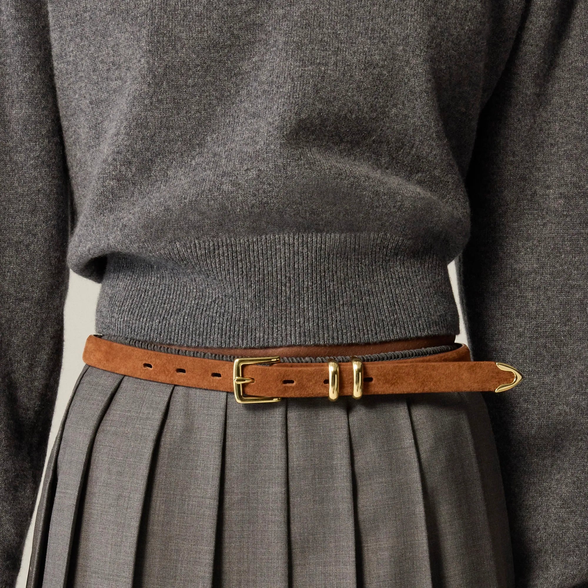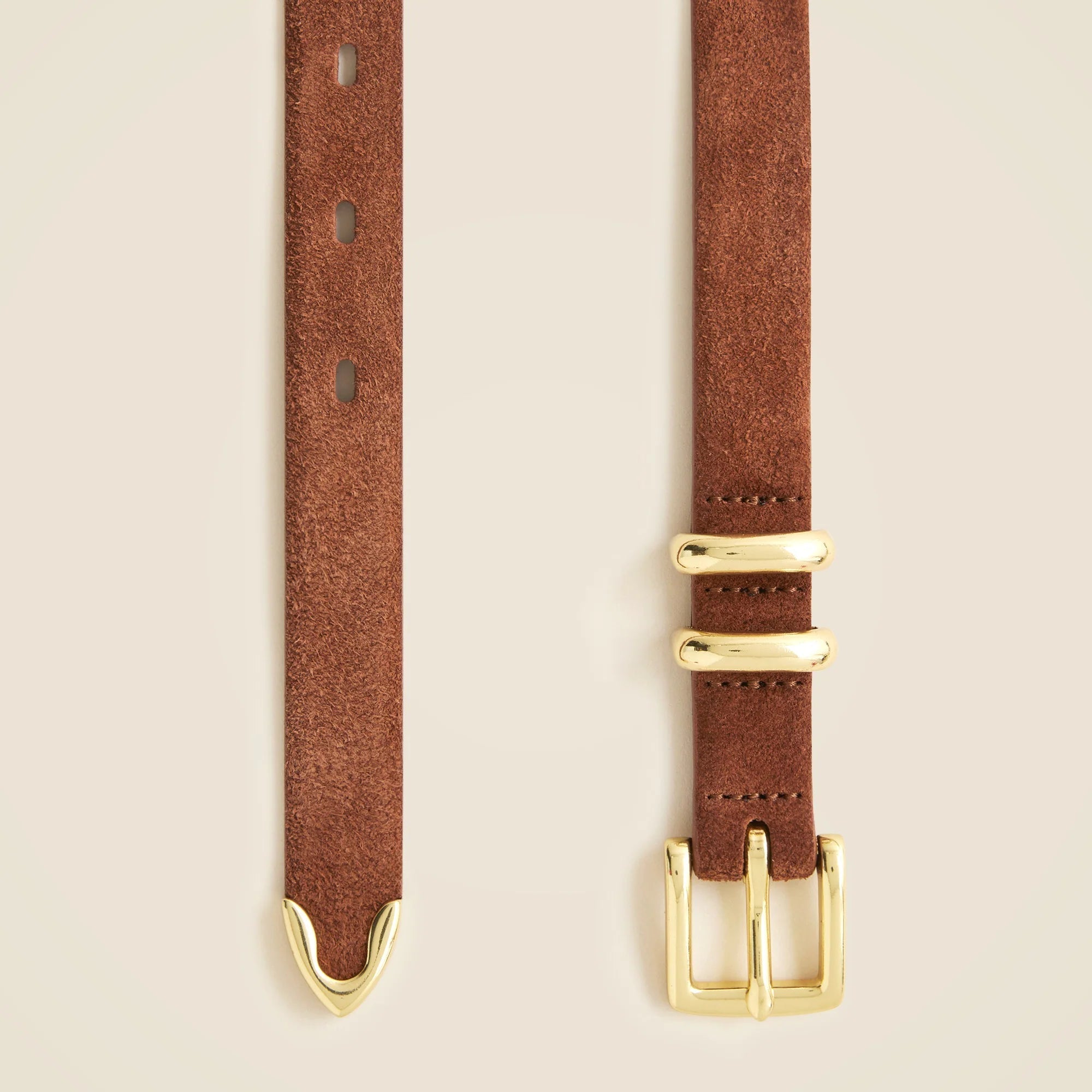 Belts are having a moment. . . We love this smooth suede style, finished with gold-tone metal hardware for an edgy touch. Please note: This style is delicate and should be handled with care.