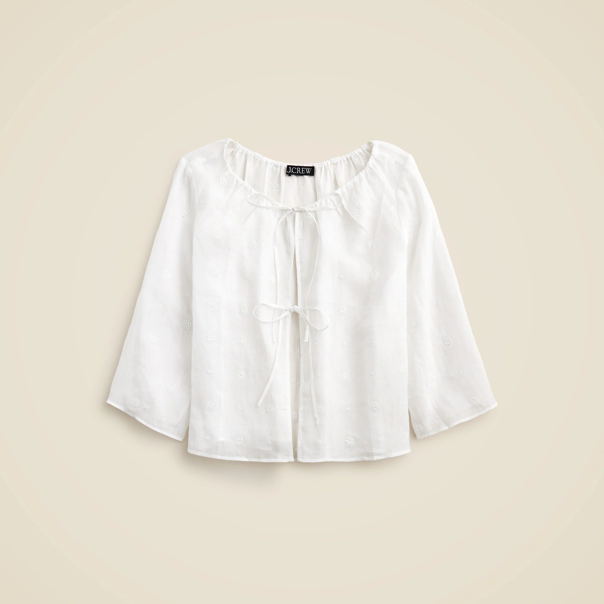 How to elevate your beach-day outfits. With this sheer, airy top, complete with two tie details down the front and intricate eyelet embroidery all over. Plus, it's crafted from 100 percent ramie, a breathable, natural fabric that's like an alternative to linen.