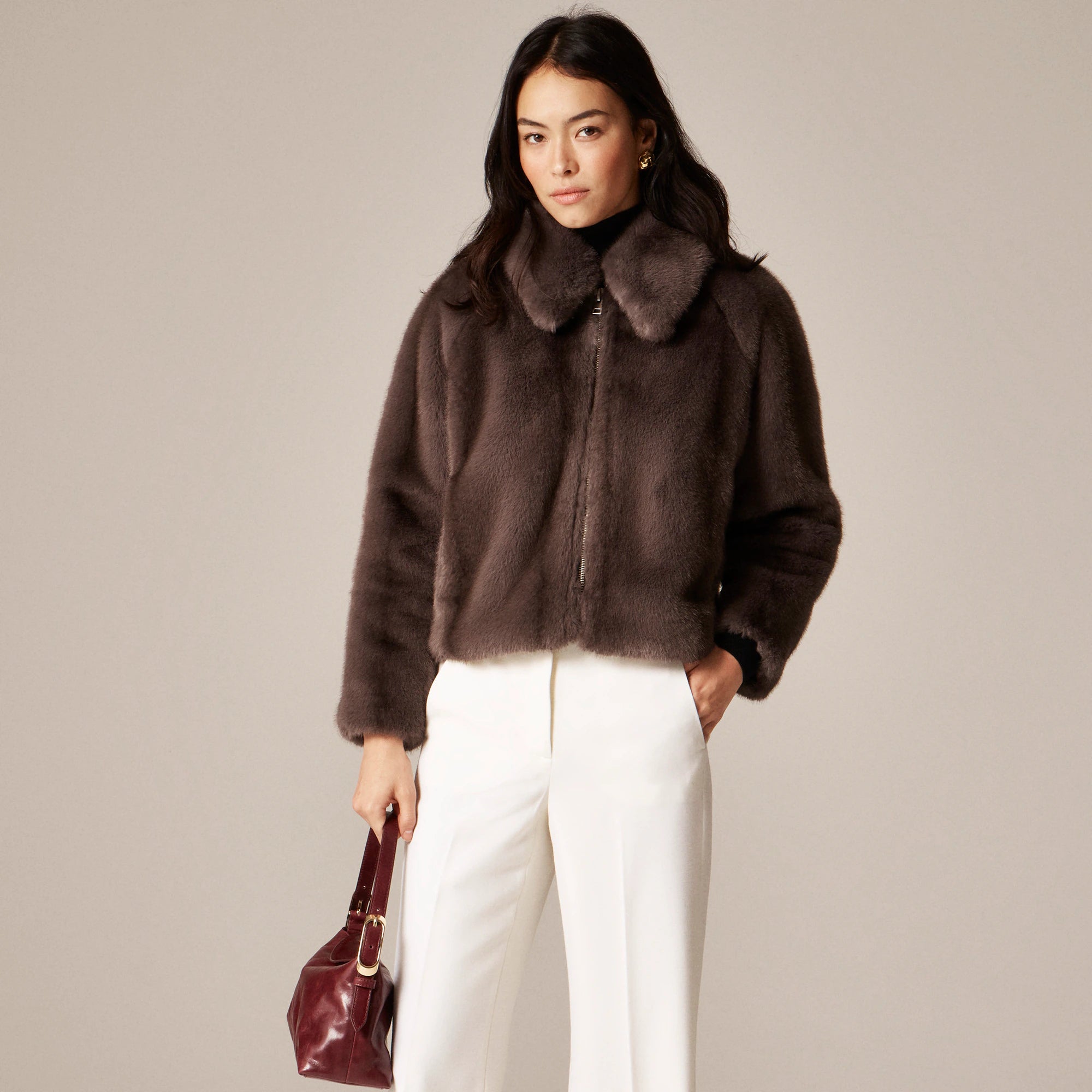 A statement in softness. This jacket is crafted from luxe faux fur that's exceptionally smooth to the touch. Designed with a clean zip front and a slightly cropped silhouette, it brings instant polish and texture to any outfit. In other words, it's the perfect layer for when you want something cozy-yet-refined.